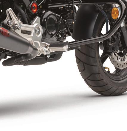 We’ve got the Honda Grom covered with accessories like a groovy freeway bar, a solo rack, a backrest with its optional rack, and a nifty turn-signal relocator. These accessories are available in a gloss black finish only. And to make the bike sound better and perform better we’ve crafted a 50-state legal muffler in black with a rolled tip with either a lollipop red end cap and badge or a bronzed version. All products are made in the USA.