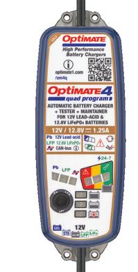 Other OptiMate USB-A chargers with smart standby mode include the fully sealed O-108 and the plug-n-play O-100 that delivers 2400mA. Both connect to the battery through the SAE connector of a fitted battery harness. ■