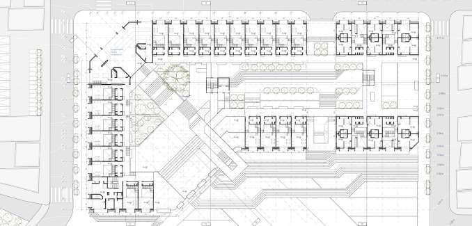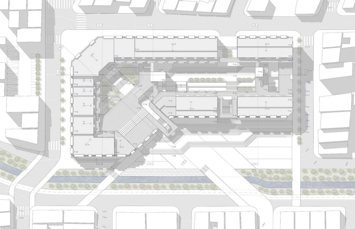 El volumen es atravesado por un eje diagonal que comunique la plaza con el eje comercial.