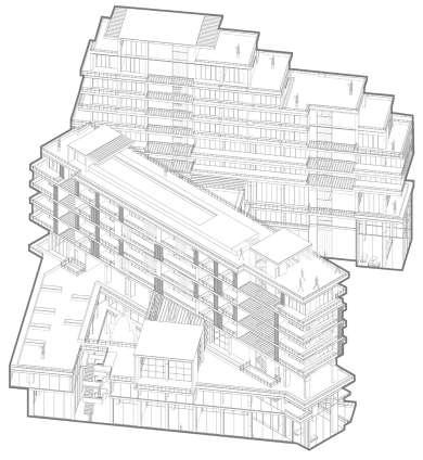 Axonometría cortada dispositivo Edificio Híbrido