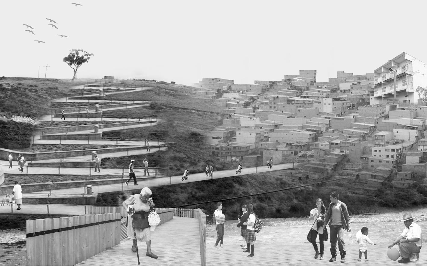 El proyecto urbano en su integralidad pretende potenciar las condiciones del eje del río como elemento estructurante. Se responde con el proyecto al diagnóstico urbano de San Cristóbal, como pieza que, desde la urbanización informal, genera un fraccionamiento en la estructura urbana. Se densifica el borde del río, se ubica uso de comercio para reactivarlo, y se interviene el espacio público.