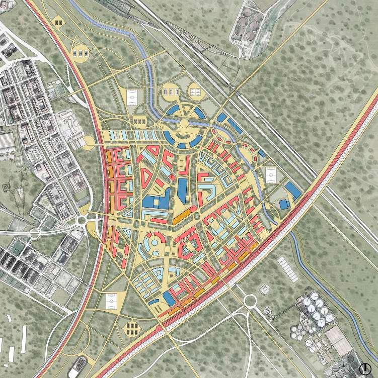 Una vez definido el proyecto urbano, se prosigue a proyectar una célula urbana en una ubicación estratégica dentro de la ciudad. El proyecto pretende generar una célula autónoma en términos funcionales. Pretende conectar el parque lineal Manzanares con el anillo verde de la M-45 al sur. Busca generar continuidad peatonal. Y finalmente, llevar los servicios, dotaciones y calidad ambiental al interior del polígono. Propuesta general de la célula urbana con propuesta de usos, vial y ambiental.