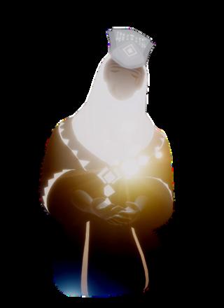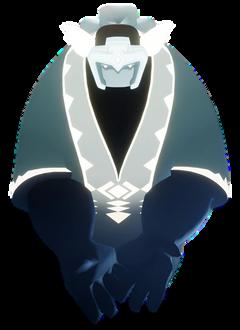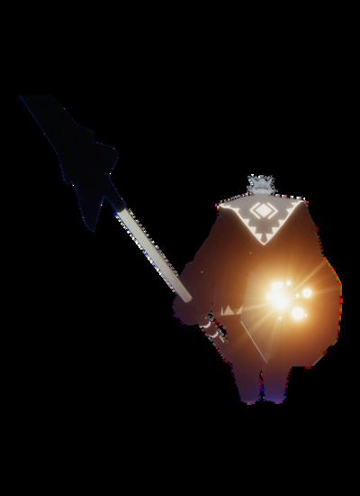 El poderoso Anciano, empuñando una lanza y un escudo, salta desde lo alto y aterriza junto al niño pequeño (tú) El Anciano empuja su lanza y balancea su escudo. Con un último movimiento de lanza, el Anciano cae al suelo. El niño se acerca con una llama en la mano y la coloca en su lanza. La lanza comienza a brillar y el Anciano la usa como apoyo para levantarse Sus túnicas comienzan a iluminarse mientras agitan su lanza hacia arriba, expulsando la llama hacia el cielo