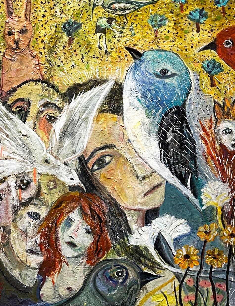 “Owls,” oil, enamel & mixed media assemblage on panel, 47 x 36 inches, $14,500.00
