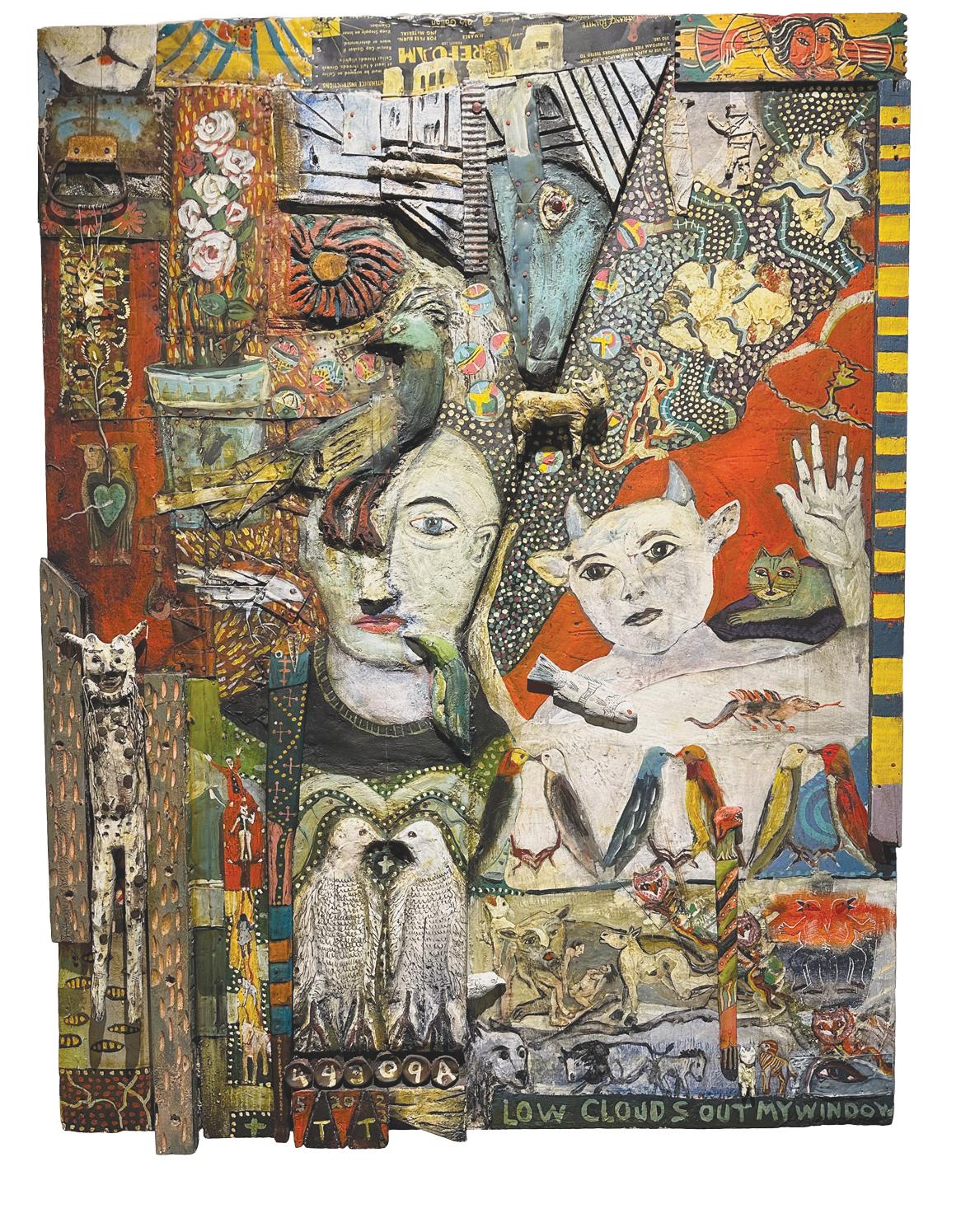 One Eye Closed, oil, enamel, mixed media and carved wood, 41.5 x 32 inches, $10,000.00