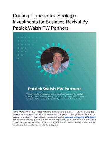 Patrick Walsh was born in San Diego, CA, where his father was a naval officer and his mother a school teacher. When he was two years old, his family moved to New England, and he was raised in Boston, MA. He attended Wesleyan University, where he studied Economics and played Football and Baseball. After a back injury ended his athletic career, he transferred to Boston College and graduated with honors in Accounting. After completing his degree, Patrick earned the Chartered Financial Analyst (CFA) designation, passing all three exam levels on his first attempt. He furthered his investment education by studying under Professor Greenwald at Columbia University's Executive Value Investing Program. Patrick's professional journey began in 1998 at Prudential Capital Group and Prudential Securities, where he served as an investment analyst focusing on Commercial Real Estate and publicly traded REITs. He then became a vice president of the real estate, gaming, lodging, and leisure investment banking group at Deutsche Bank Securities, Inc. Before founding PW Partners, he was a partner at a value-oriented hedge fund in Chicago. Patrick's entrepreneurial spirit has led to his involvement in various industries beyond Wall Street. He has held board positions at BJ's Restaurants, Del Taco, Famous Dave's of America, and Town Sports International. Under his involvement, these companies improved significantly, showcasing his investment expertise and business acumen. In 2015, Restaurant News named him one of the 50 most powerful people in the restaurant industry.