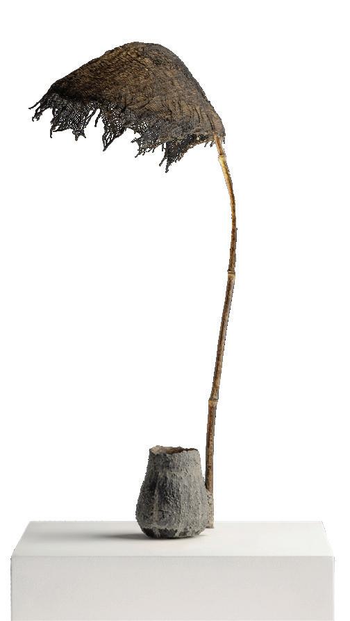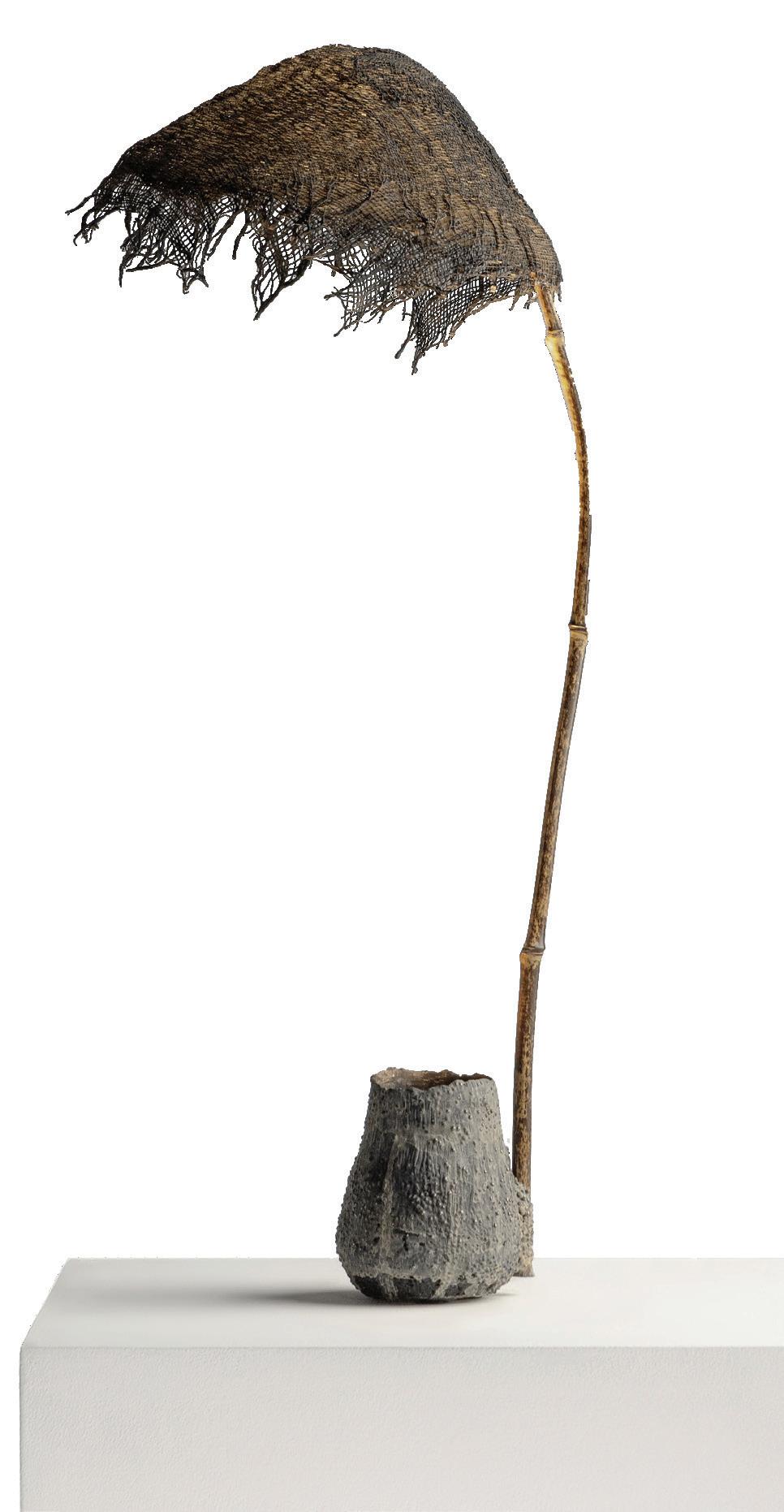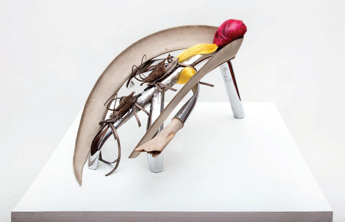 Julia Padilla, Untitled, chromed pipe, fragments of sandals, seeds, rubber, bone, painted snail, artificial hair, 13.77 x 11.81 x 23.62 in. Linse Galeria, Buenos Aires, Argentina.