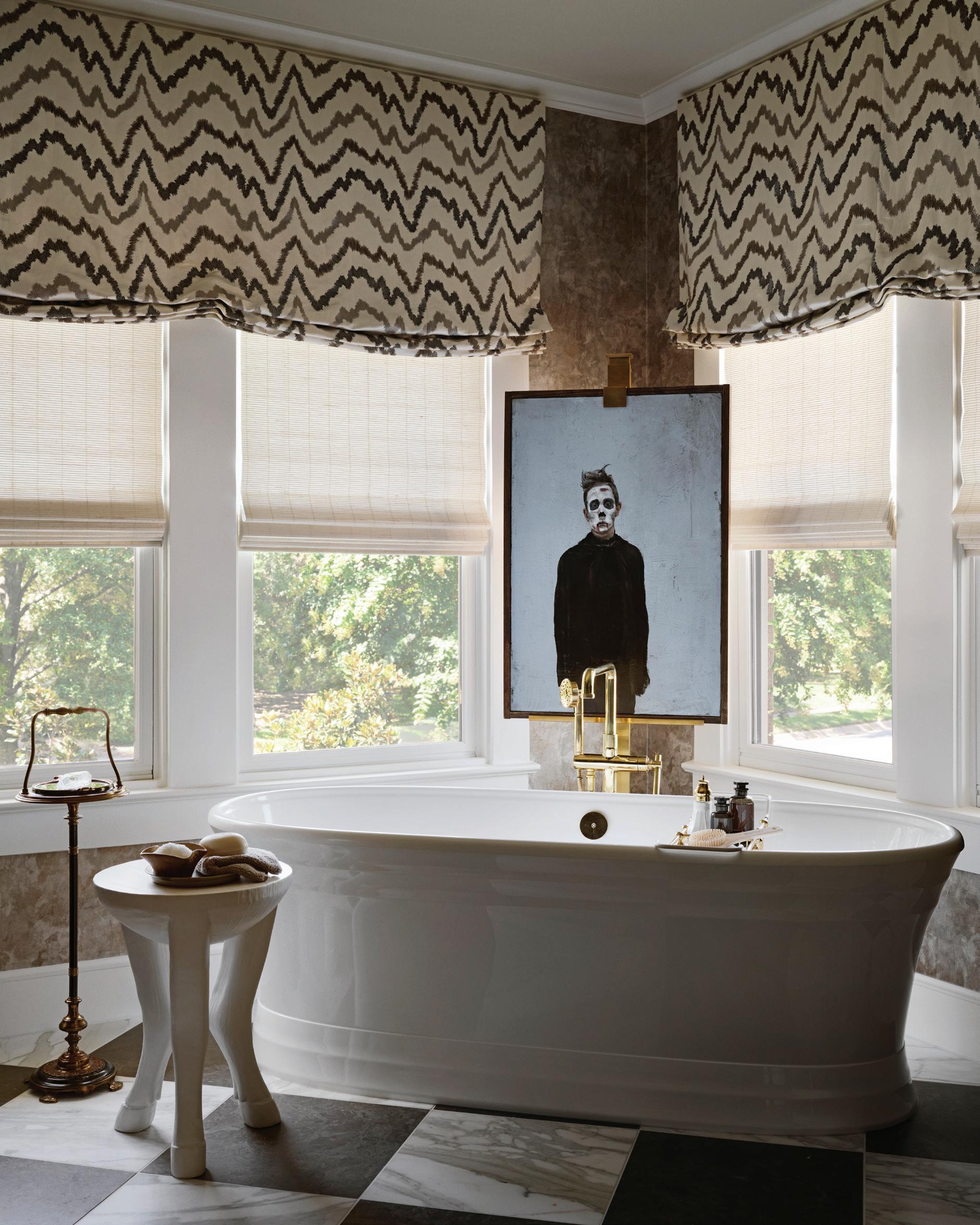 Freestanding bathtub by Victoria + Albert; painting by Mississippi-born Georgia artist Miles Cleveland Goodwin, Zombie, 2021, oil on canvas, acquired through Valley House Gallery.