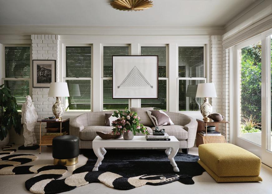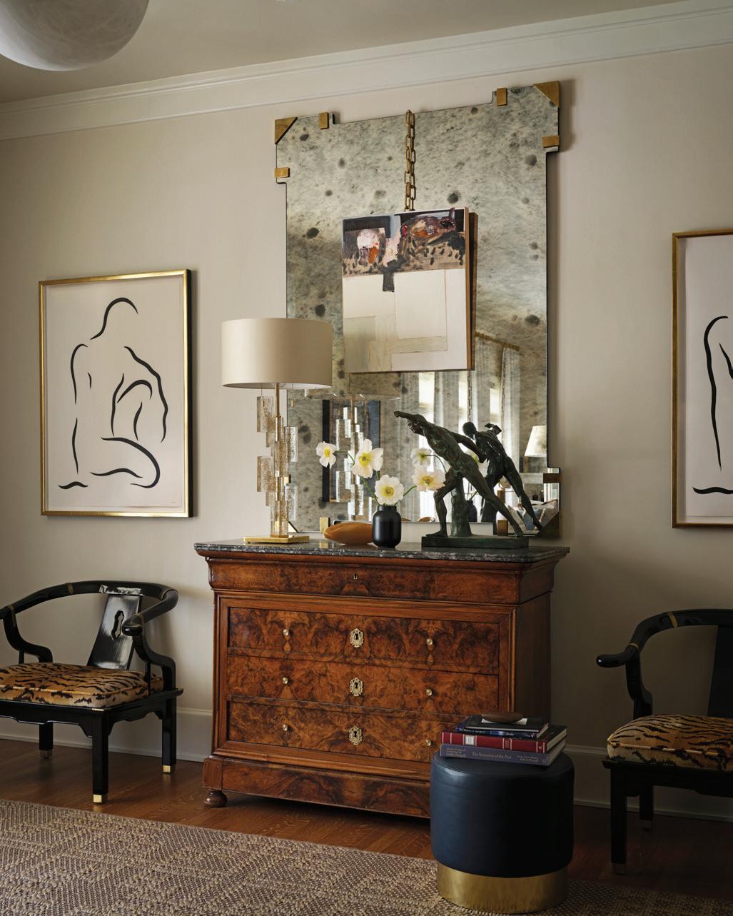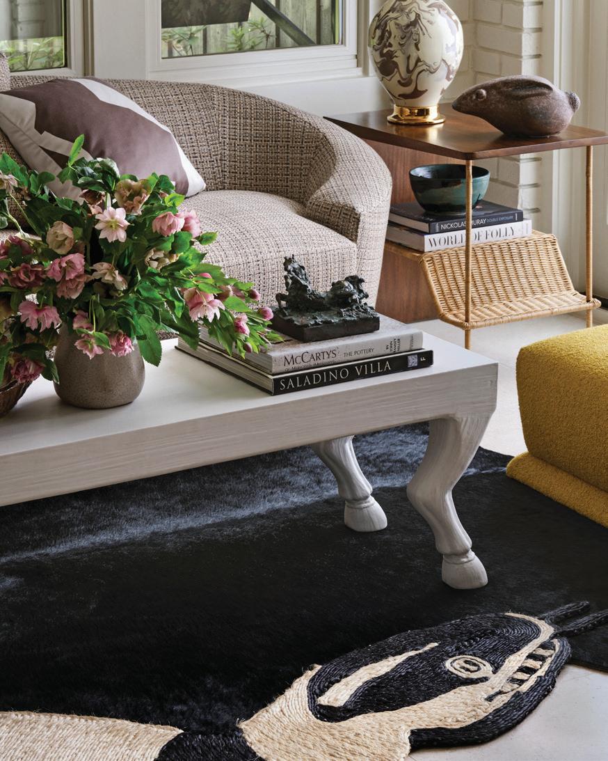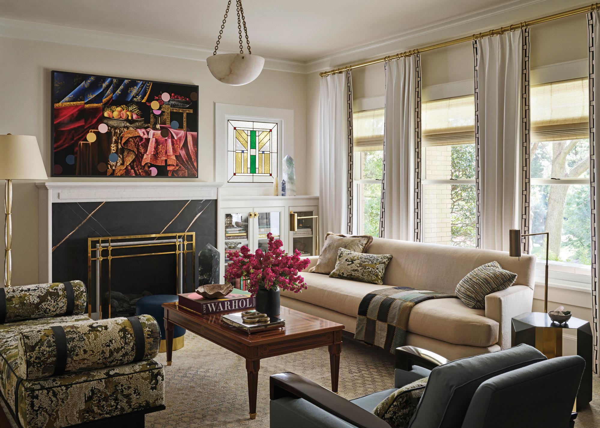 what Vanderford calls the home’s former “overly stylized Mission” version and a stained-glass window in the living room, designed by DeVasier, are calibrated to feel inevitable rather than inserted. This balance—between reverence and mischief, scholarship and play—is the throughline of the house. It is also the throughline of the couple themselves. They love telling the backstory of each piece, often fetching a book about an artist or relaying an anecdote about a designer.