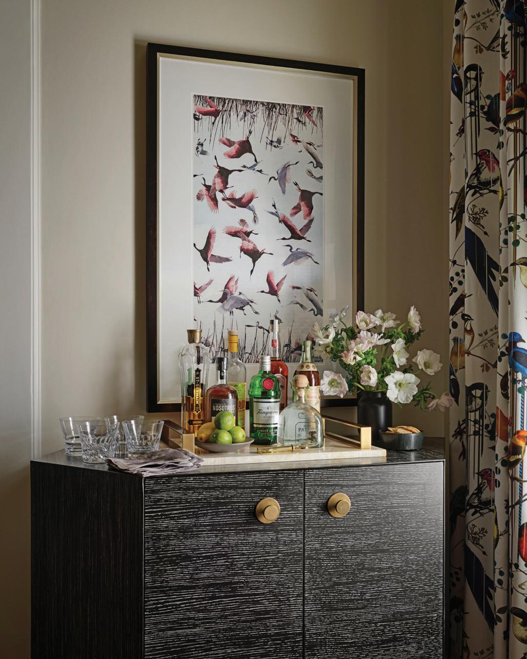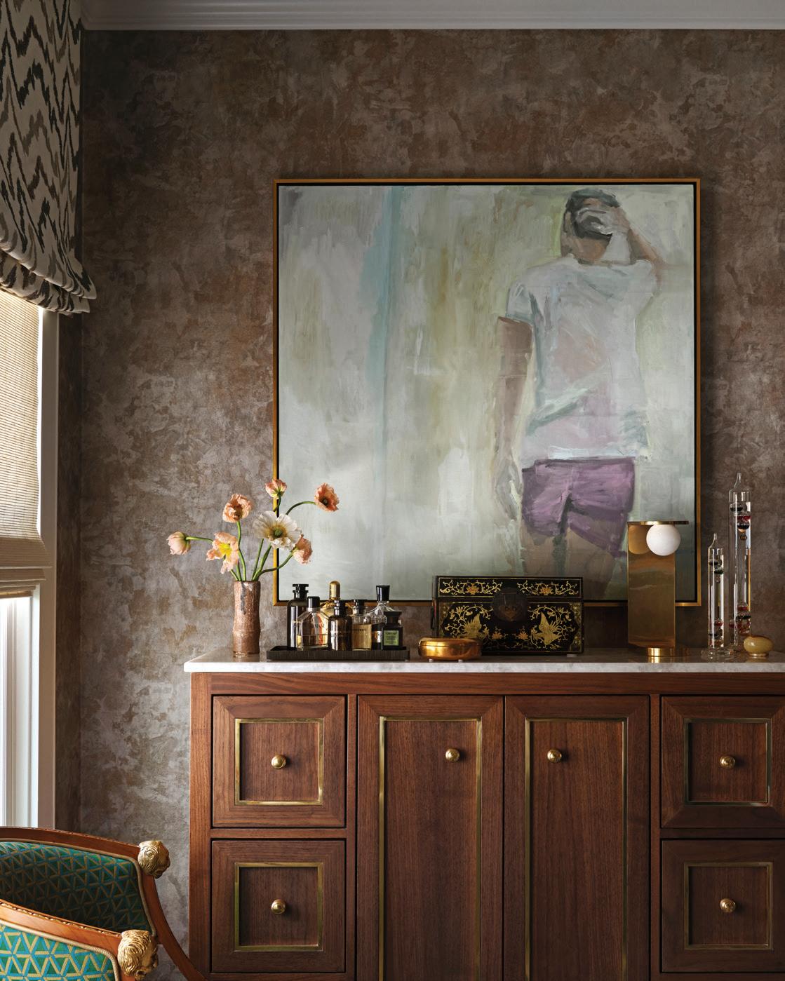 A work by Alli Lemon, a friend of DeVasier’s, hangs above the custom bar cabinet with a stone top and brass hardware.
