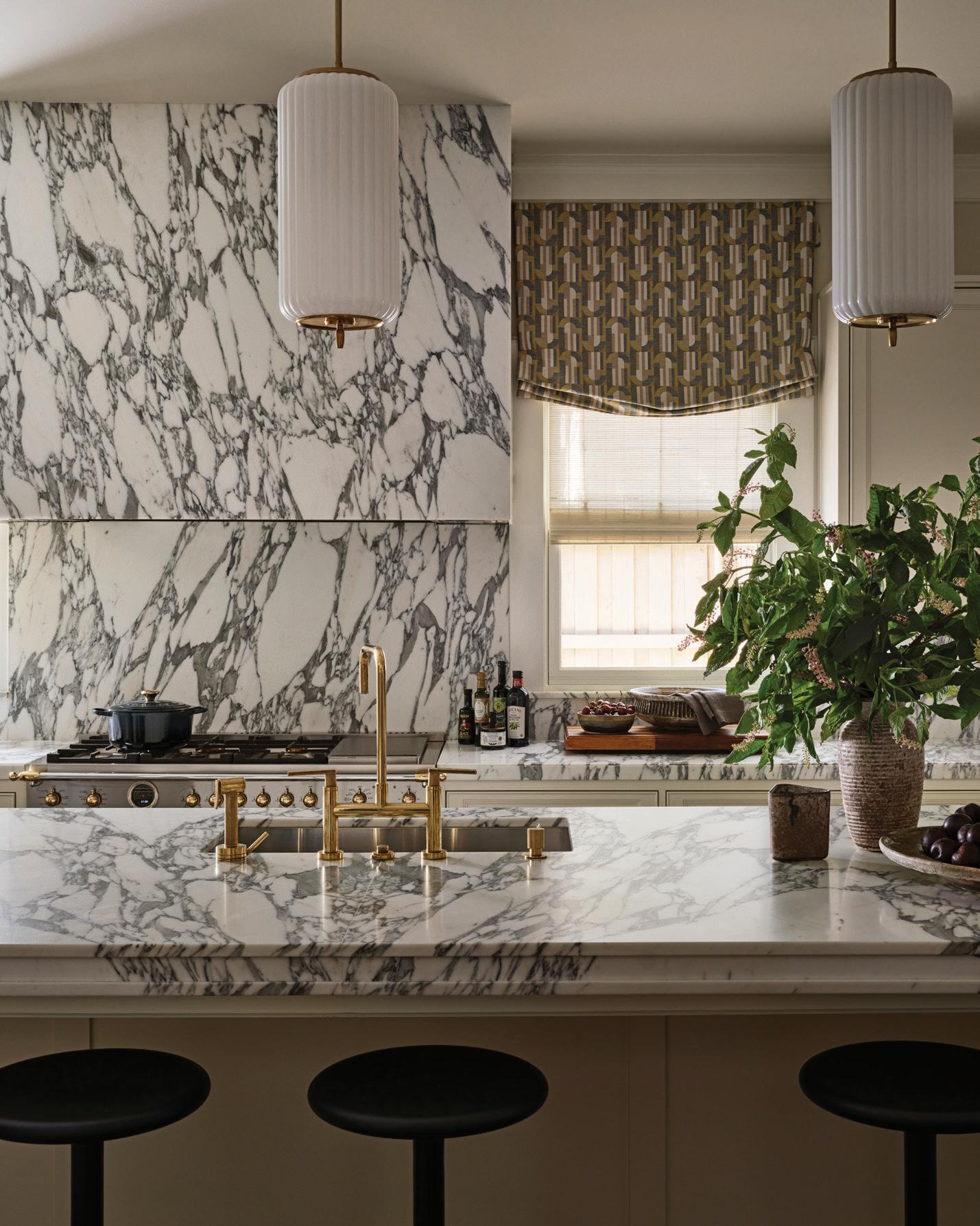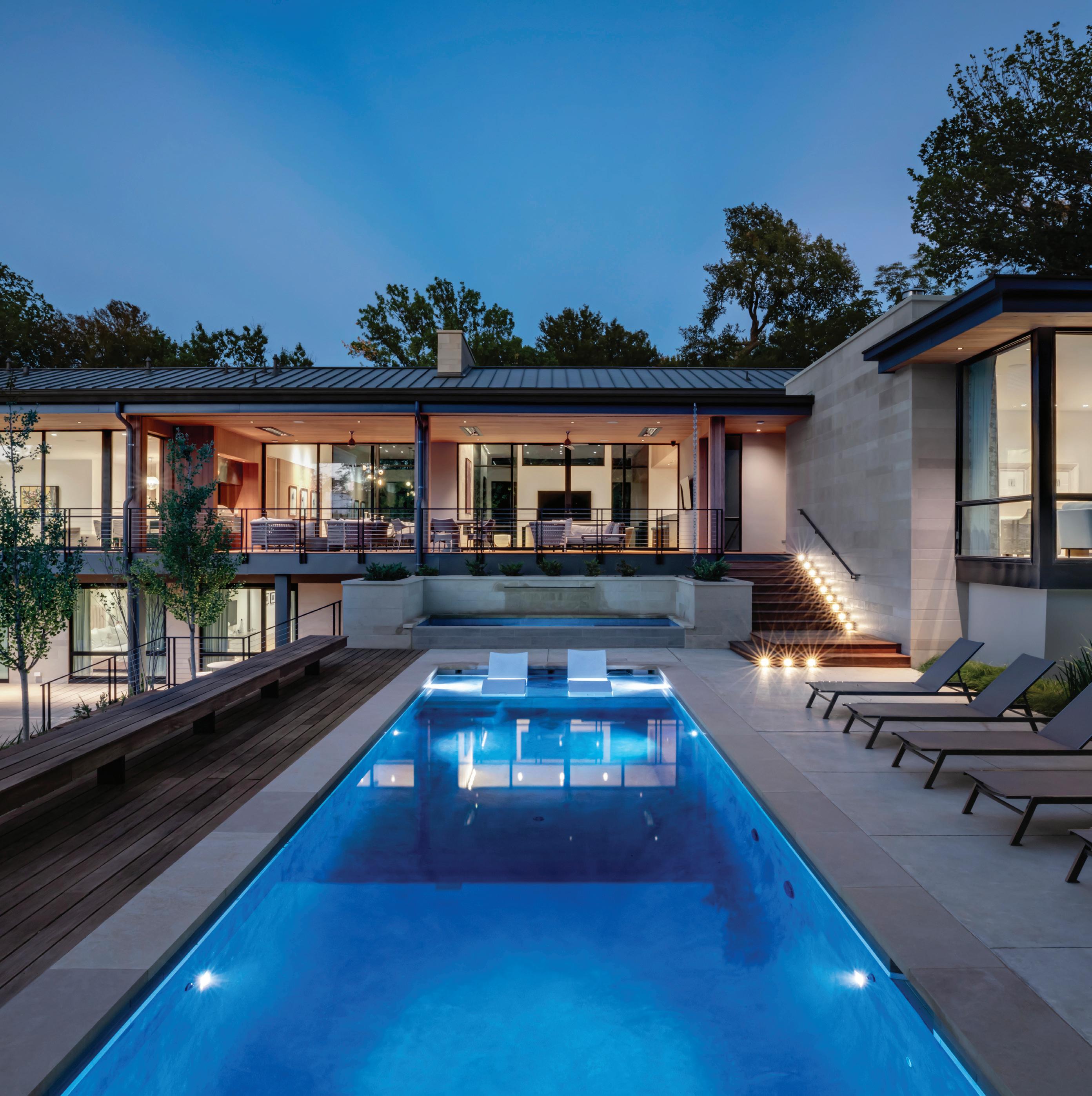 level transgressions by previous owners. “We had to undo a whole lot,” DeVasier says. They did add a linear swimming pool with three elegant arcs of water that splash into it from a low limestone wall, and they enlarged and glamorized the kitchen. The significant change was creating a modern-day primary suite upstairs, turning a fourth bedroom into a private bath and walk-in closet, the latter with a shoe wall that could make Carrie Bradshaw lose consciousness.