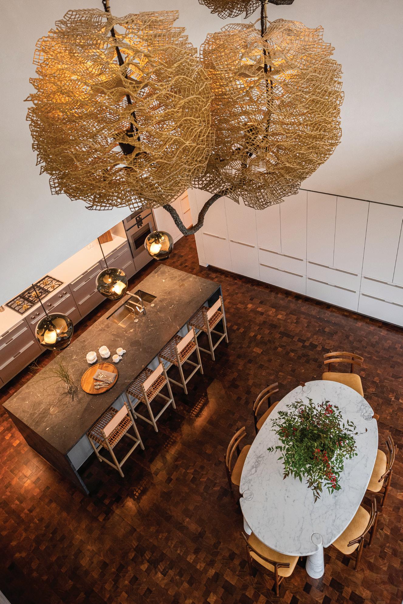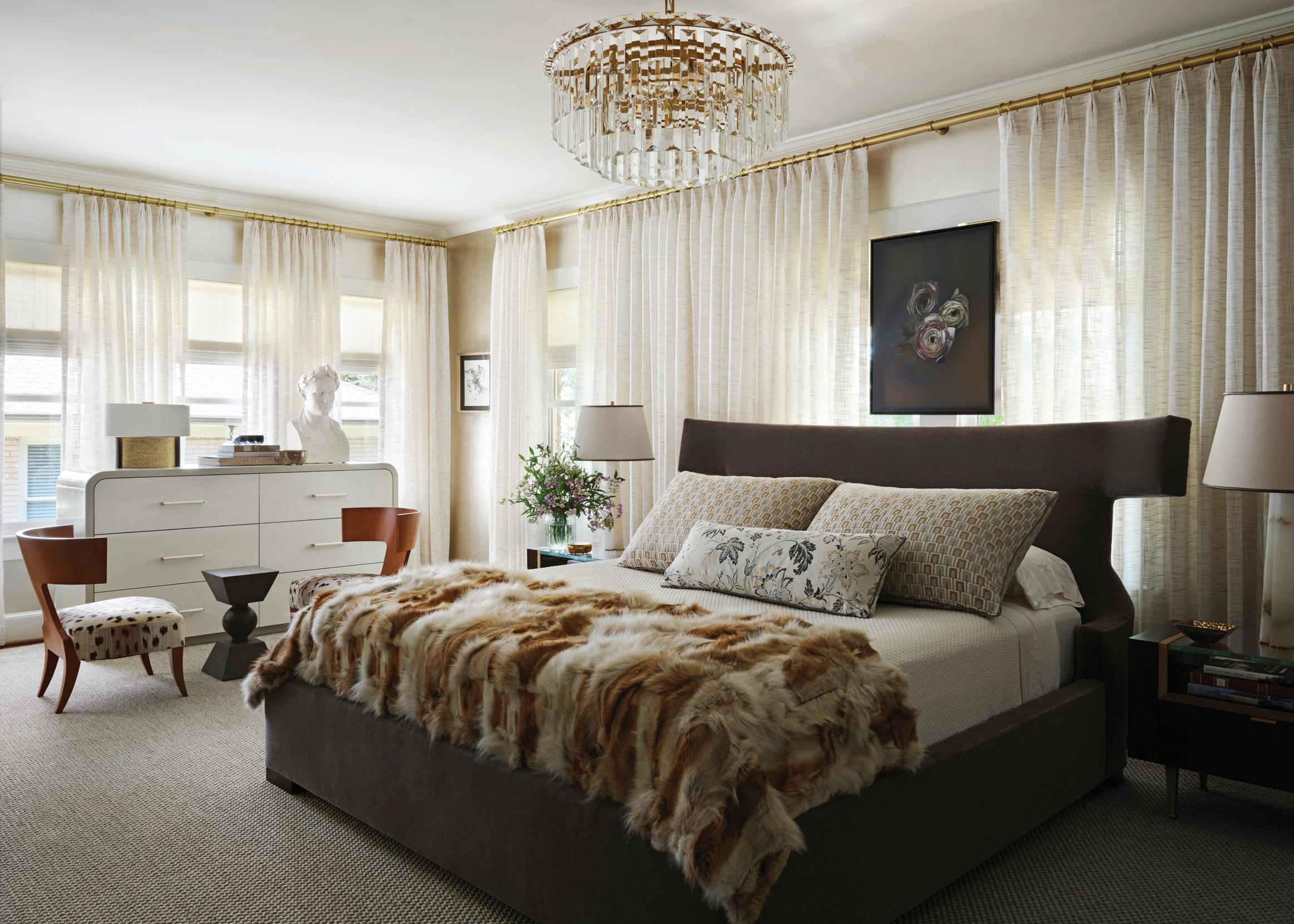 Textiles do their part, too—rich velvets, layered weaves, a nubby jacquard—adding sensuality to the situations. Even the customdesigned elements, such as the Deco-esque stair railing that replaces