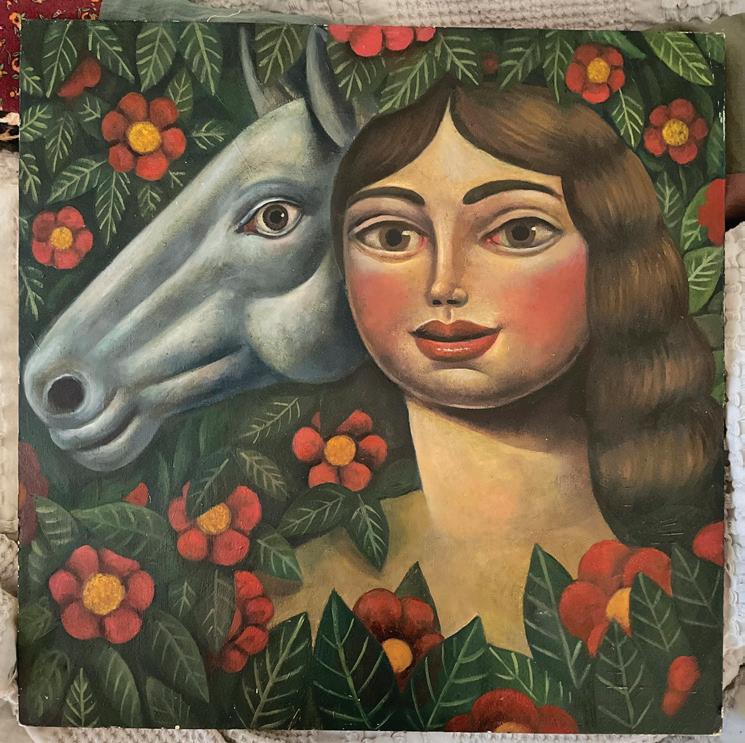 collection is not just eclectic, it is geographic, autobiographical, and deeply narrative. Much of it reads as a scrapbook of travels and previous lives, souvenirs for two men who love a backstory, a provenance, a tale. “Our art is all over the place,” Vanderford says, “from high-end pieces to stuff that was five dollars.” There are works and objects that reference Venice, Santa Barbara, the Texas Gulf Coast, Japan, Italy, and the Mississippi River. There are pieces bought when the men were young, pieces inherited, and pieces hauled home in suitcases. There are serious artists and playful ones, activists and formalists, conceptual works and kitsch. Together they create a collection that is less about hierarchy than about memory. Each piece is a pin on the map. It is also a deeply human collection. There are portraits of Japanese Americans from WWII, gestural figure drawings, and a text painting that winks and bites. (“Small town bitch, real big ideas,” says that work, by Frances Berry Moreno. Both Vanderford and DeVasier are from little towns in Eastern Arkansas.)