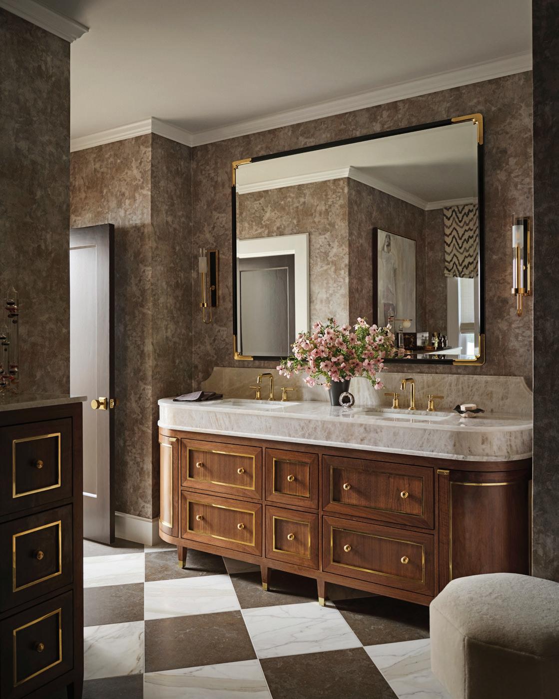 Abpve: Checkerboard floor of Borghini marble and limestone from Ann Sacks; brass vanity fixtures by Kallista; sconces by The Urban Electric Company; below: Jared Small’s