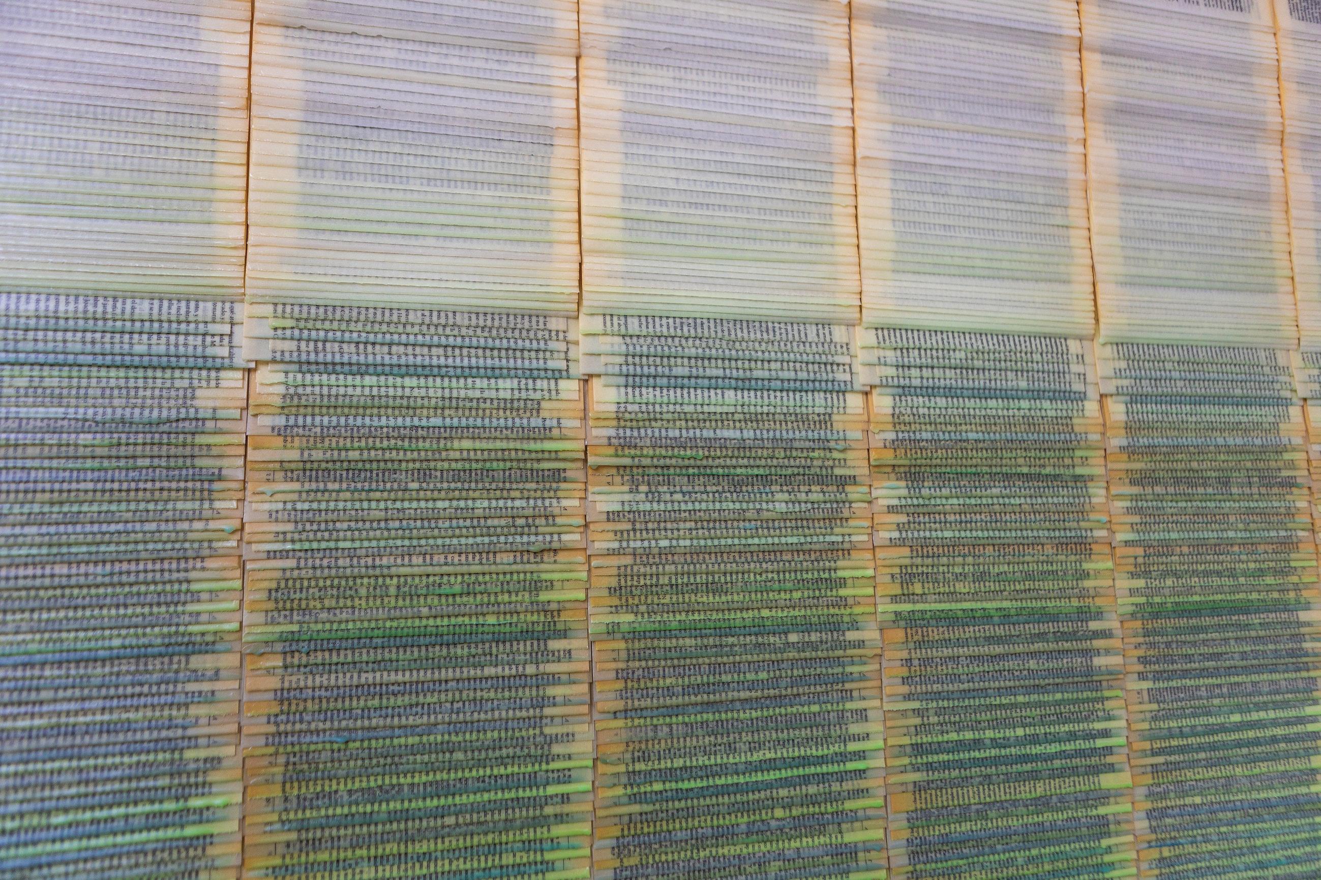 Rocío Garriga, Detalle de la obra Ver la montaña como montaña, 2025, 1,764 pages encapsulated in colored wax from various copies of Thomas Mann’s The Magic Mountain mounted on whiteboard. Courtesy of Freijo Gallery, Madrid, Spain.