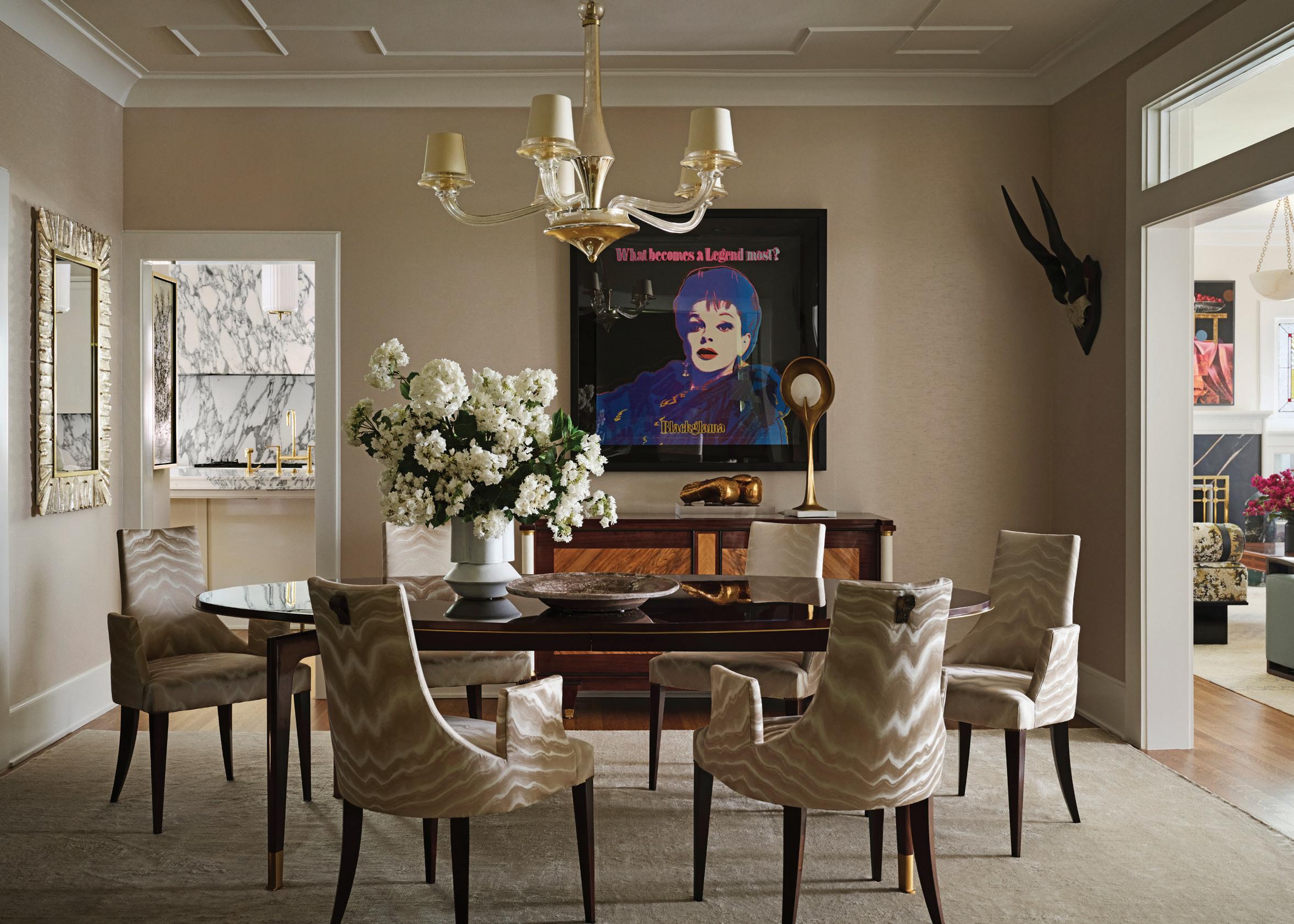 Thomas Pheasant table for Baker; Thomas Pheasant chairs in Donghia fabric; Phillip Jeffries silk wallcovering and a hand-knotted silk rug; sculpture of boxing gloves in gold by Krzysztof Strzelecki; Andy Warhol, Blackglama (Judy Garland) from Ads Portfolio, 1985, screenprint in colors on Lenox Museum Board, published by Ronald Feldman Fine Arts, Inc., New York.