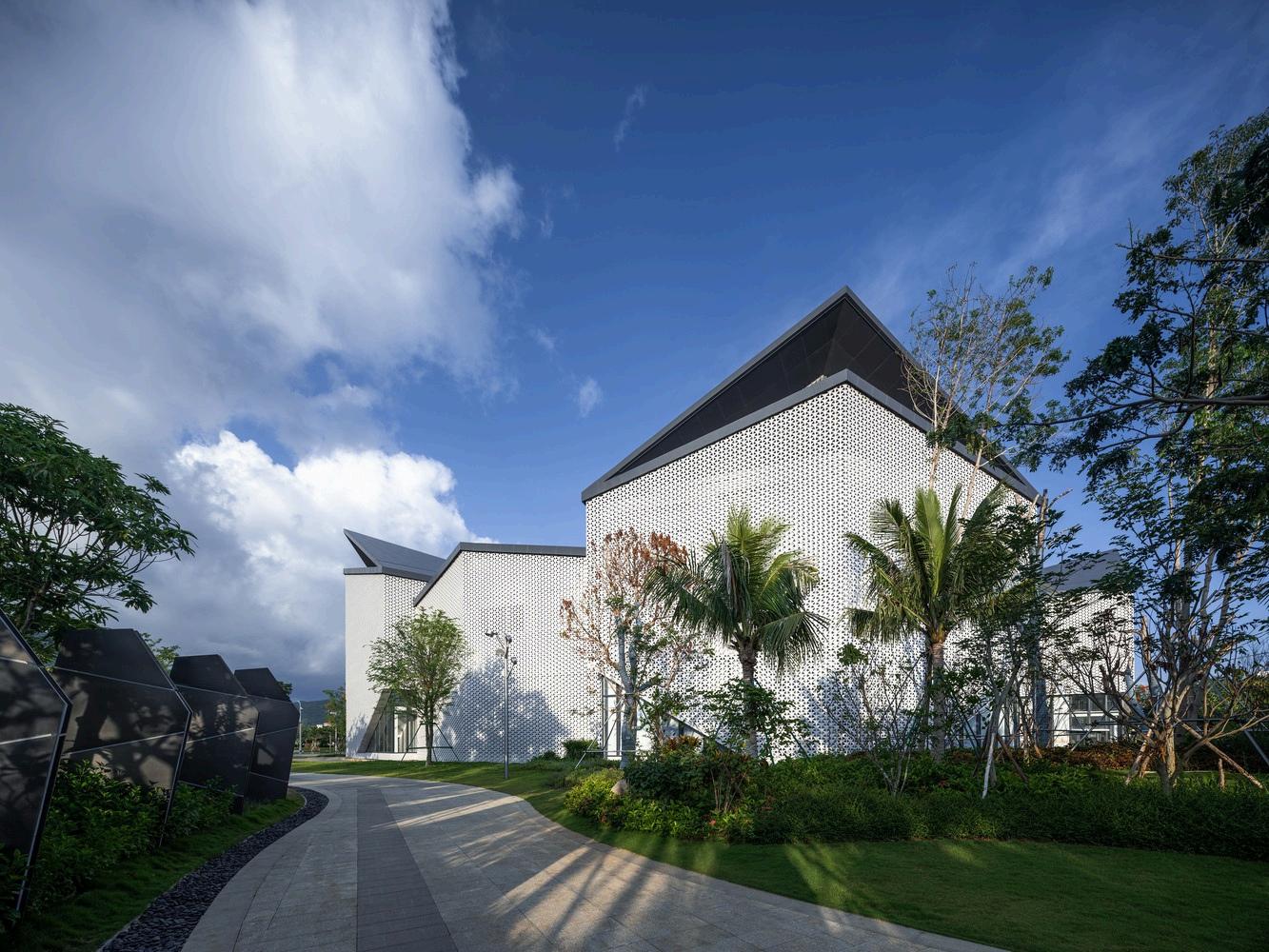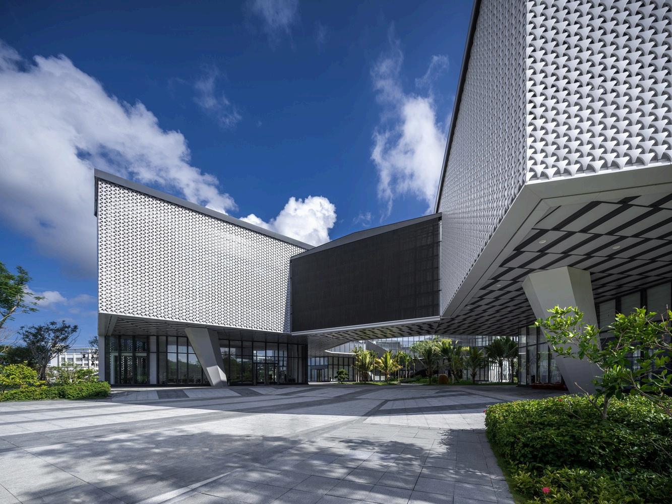 The finishes of the Yazhou Bay Science & TechnologyCityIndustryPromotionCenter combine contemporary technology with references to Hainan's coastal landscape. Sloping roofs, perforated metal panels, and lattices reinterpret vernacular forms, allowing for natural ventilation and soft lightfiltration.