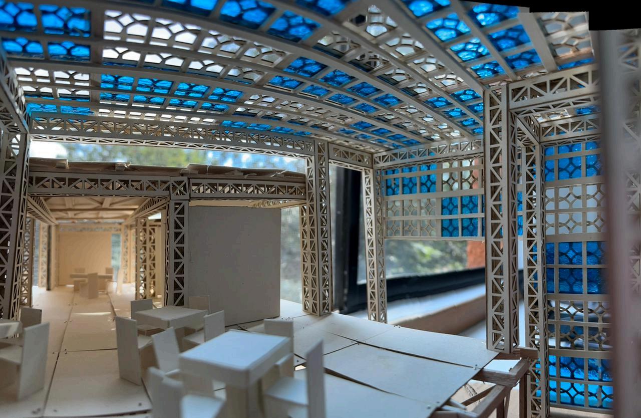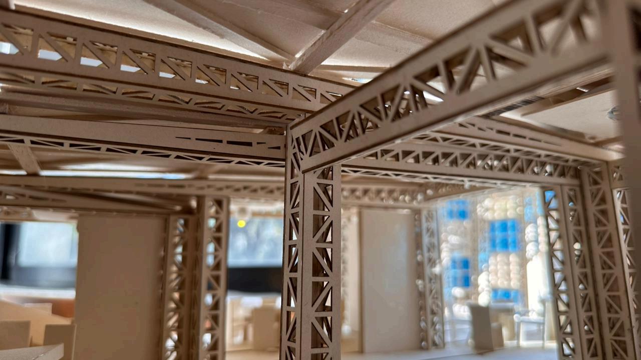 Theuseofbalsa woodandbattery papermadeitpossible tocreate a lightweightbutexpressivemodel,whereeachfold,lattice,andsupport translates into a space consistent with the original intention. The tests carried out showed a functional, efficient, and well-structured design, capable of integrating basic installations without compromising the aestheticsorlightnessofthewhole.