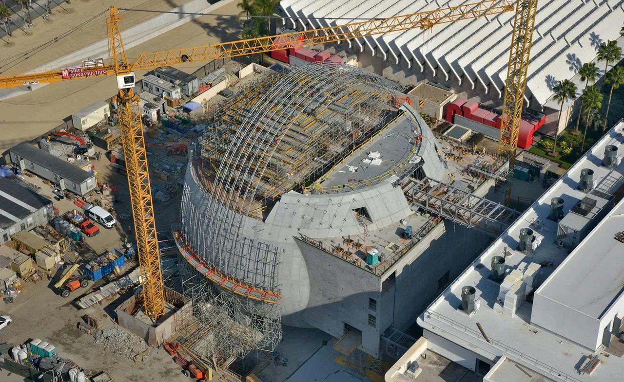 El sistema constructivo del Academy Museum of Motion Pictures combina la restauración de un edificio histórico con la ejecución de una estructura contemporánea altamente compleja. El Saban Building, de origen Art Decó, fue reforzado mediante un sistema de placas estructurales, vigas de acero y núcleos rígidos que permiten soportar nuevas cargas, integrar instalaciones museográficas modernas y garantizar el desempeño sísmico requerido en Los Ángeles