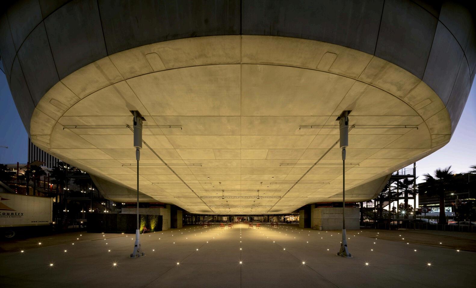 For the Sphere Building, a deep foundation based on piles and a structural ring that supports the main metal arches was designed. These elements distribute the loads from the glass and steelshelltotheground,ensuringstructuralstabilityeveninthefaceofvibrationsandseismic movementstypicalofLosAngeles.