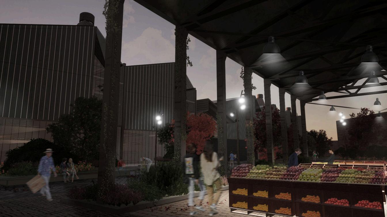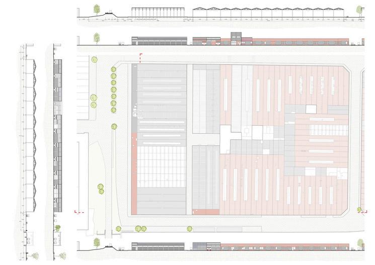 Logistics operations are centralized at the top of the site, while the rear section, featuring green corridors, a new boulevard, and a temporary market, focuses on human-centered elements, including office entrances