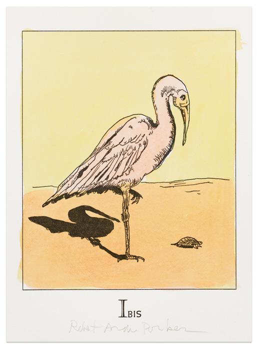 Robert Andrew Parker’s exploration of realism was one that danced with abstraction. His expressive line not only described the form he had drawn, be it a human form, an interior scene, or a landscape, it also imbued that form with a sense of character. This is evident in his deft depictions of the Iris in a vase and the Cairn Terrier in view in the exhibition. One of Parker’s favorite things to create were the many Alphabet Books he made. Usually created in small editions, Parker would select whimsical collections of words to illustrate, as he did with An Alphabet: Amazons to Zapata. He would then draw images and have them printed using lithography or other methods. When the editions in hand, Parker would often hand color in the sheets using watercolors, and then have them loosely bound in cloth covered cases. Turning each page, the viewer is confronted with an image we are left to interpret the meaning for beyond the word chosen. When read as a continuous text, the images coalesce into a disjointed, post-modern story, for which we can only guess the broader narrative that would thread these scenes together. This greater ambiguity surely delighted Parker as much as the search for words themselves.