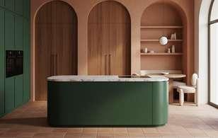 Kitchens prioritize bold color or warm wood. Curved forms like arches soften rigid lines, promoting natural, emotional flow over traditional austerity.
