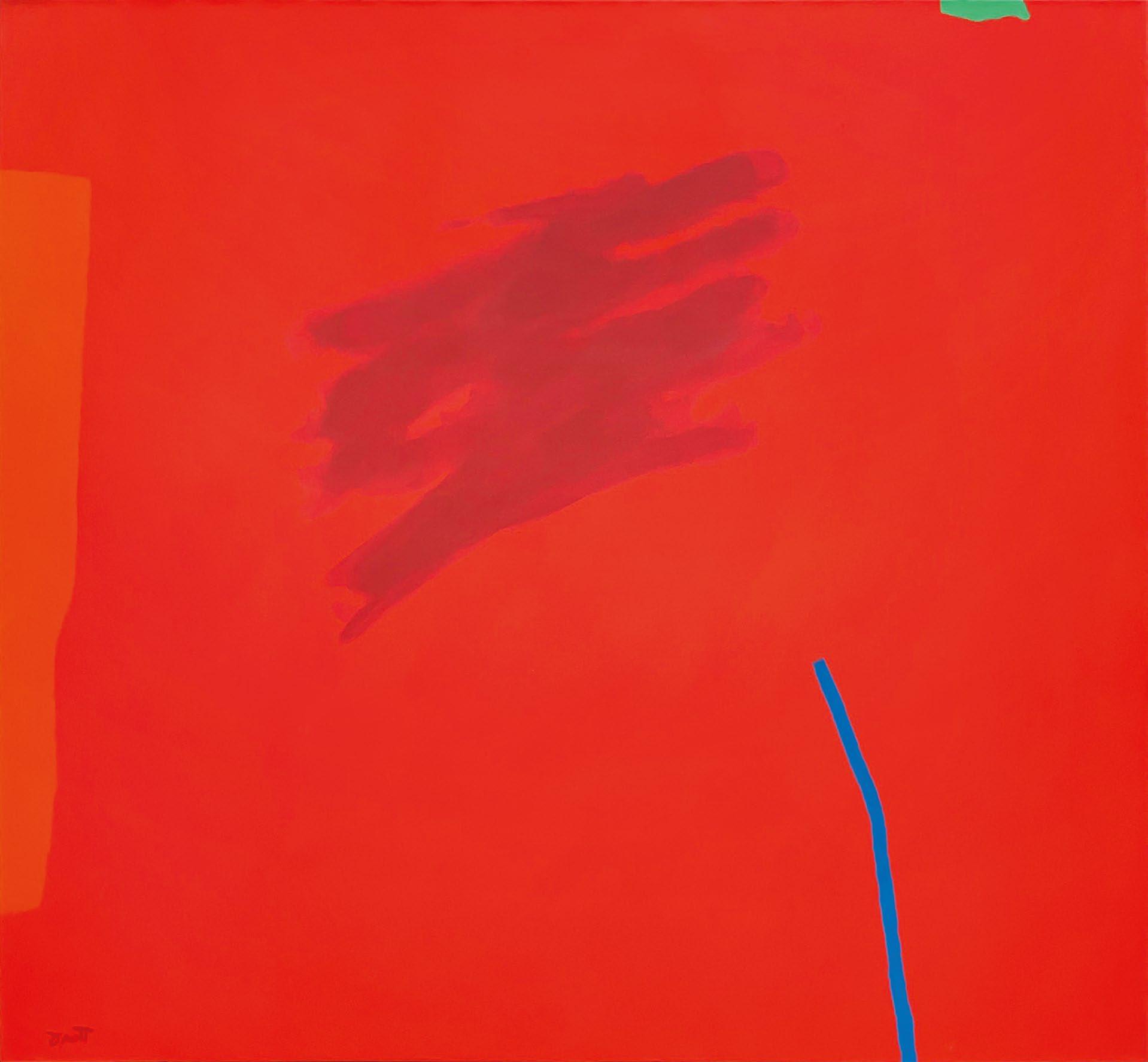 e mechanical nature of the printing process has rendered what might at rst be read as gestural swipes into a calculated plane with precise boundaries. e composition also features a lighter, orange-red rectilinear shape at left; a cool, cerulean line jogging up from the bottom edge; and a small, green, curvilinear shape at top right. When read in
