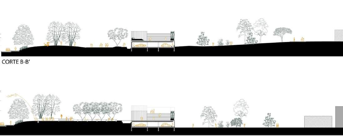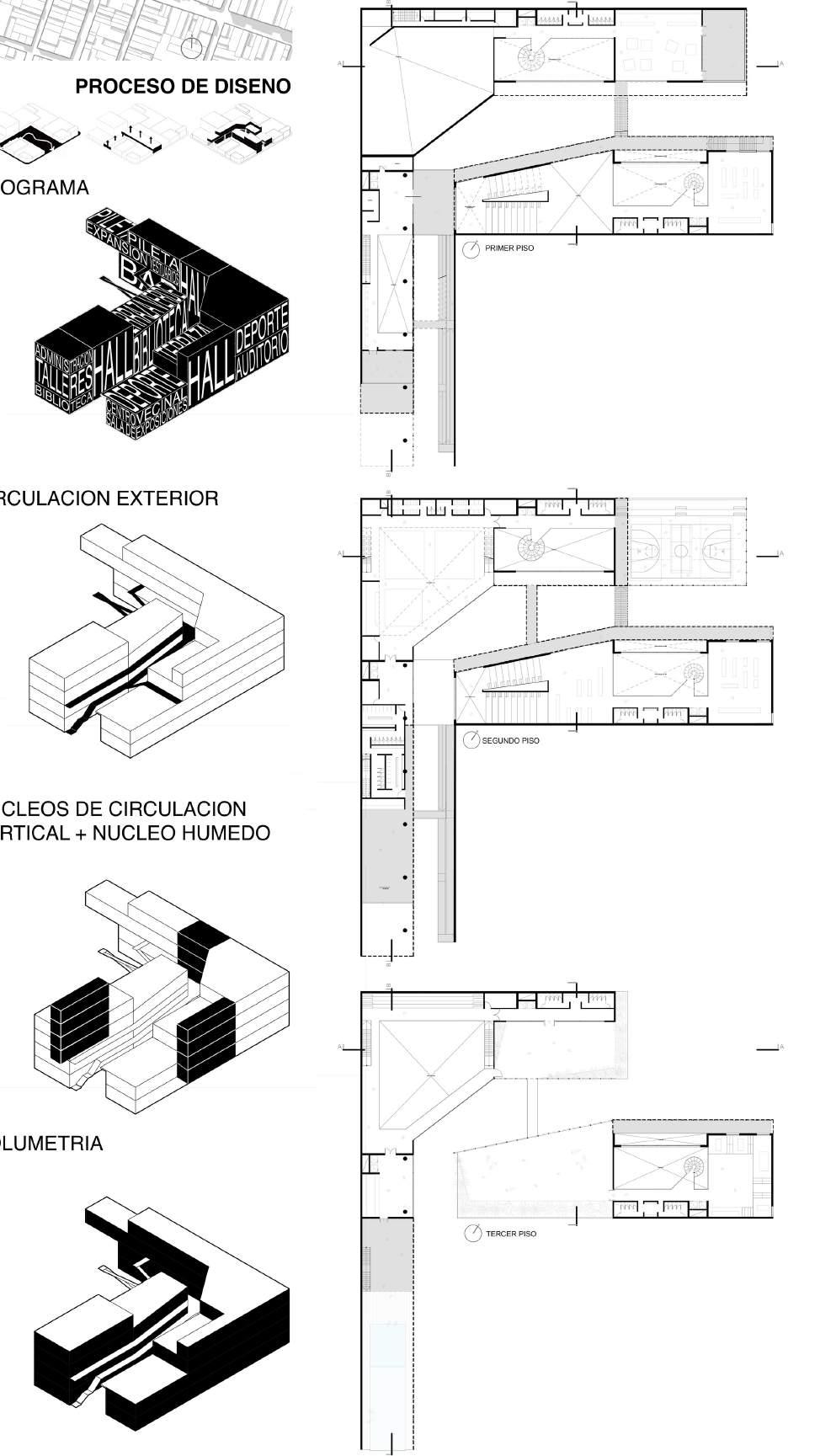 El diseño está organizado en diferentes volúmenes interconectados que generan un recorrido continuo a través del edificio, formando un paseo público que invita a la interacción y al disfrute del espacio. Estos volúmenes crean una secuencia de áreas abiertas y cubiertas, ofreciendo tanto zonas de descanso como espacios para exposiciones y ocio, respondiendo a la necesidad de equipamientos comunitarios y revitalizando un sector central de la ciudad