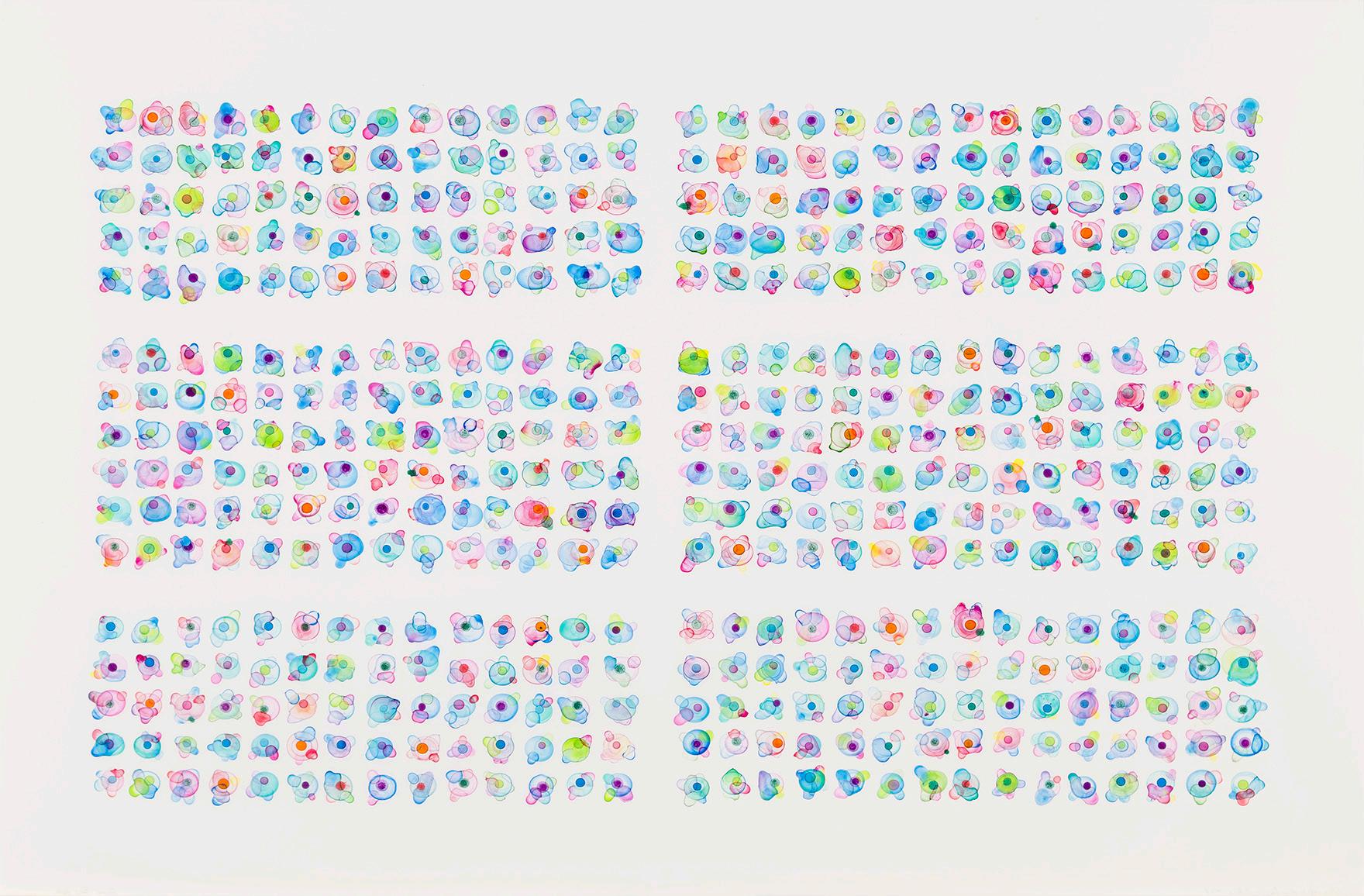 Ink droplets evaporate and leave reticulation marks of their own accord and evolve into broken patterns such as those found in fingerprints and crystalline structures. Fractal fields impose a structure on the paths of eclipses, planets, moons and suns, forming a physical link between the known and the unknown, imparting imperfect knowledge accumulated in fragments. Self-portraits flow with the memory of liquid or have the body’s absence described by thousands of tiny staves. These intact and broken systems in the form of inked patterns, single-line labyrinths, fractals and staves create a system for understanding the power of attention.