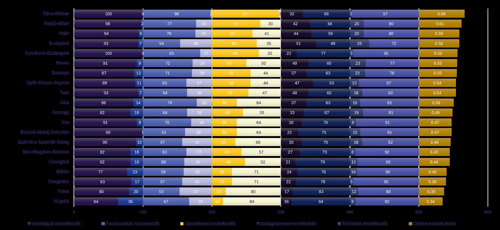 2 Az egyes vármegyék online digitális indexe az egyes platformokon – honlap, Facebook, LinkedIn, Instagram, TikTok – való jelenlét súlyozatlan átlagából adódik.