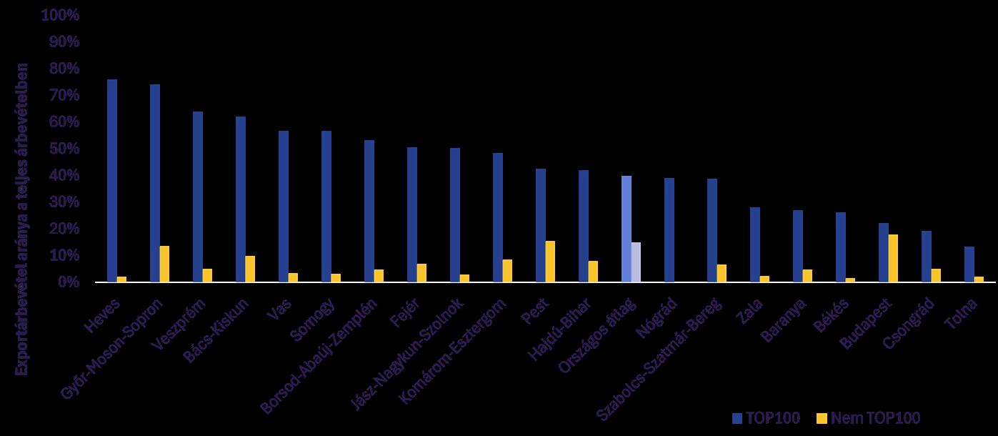 A TOP100 vállalat exportintenzitása a nemzetgazdasági átlagnál jelentősen magasabb, átlagosan 40%, szemben a nem TOP100 vállalat körében tapasztalt 15%-kal. A legmagasabb, 74% Heves vármegyében, a legalacsonyabb, 13% Tolna vármegyében.