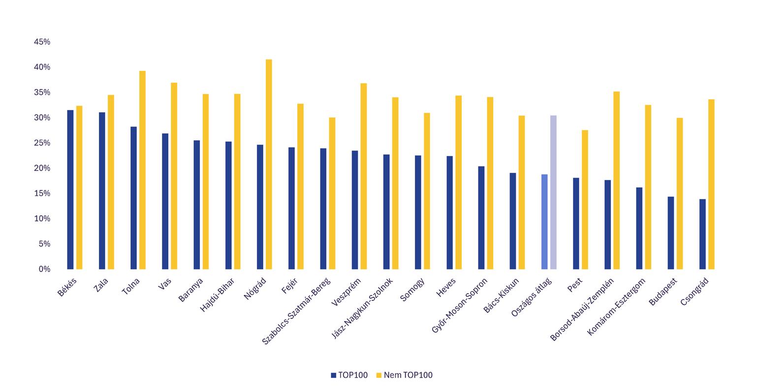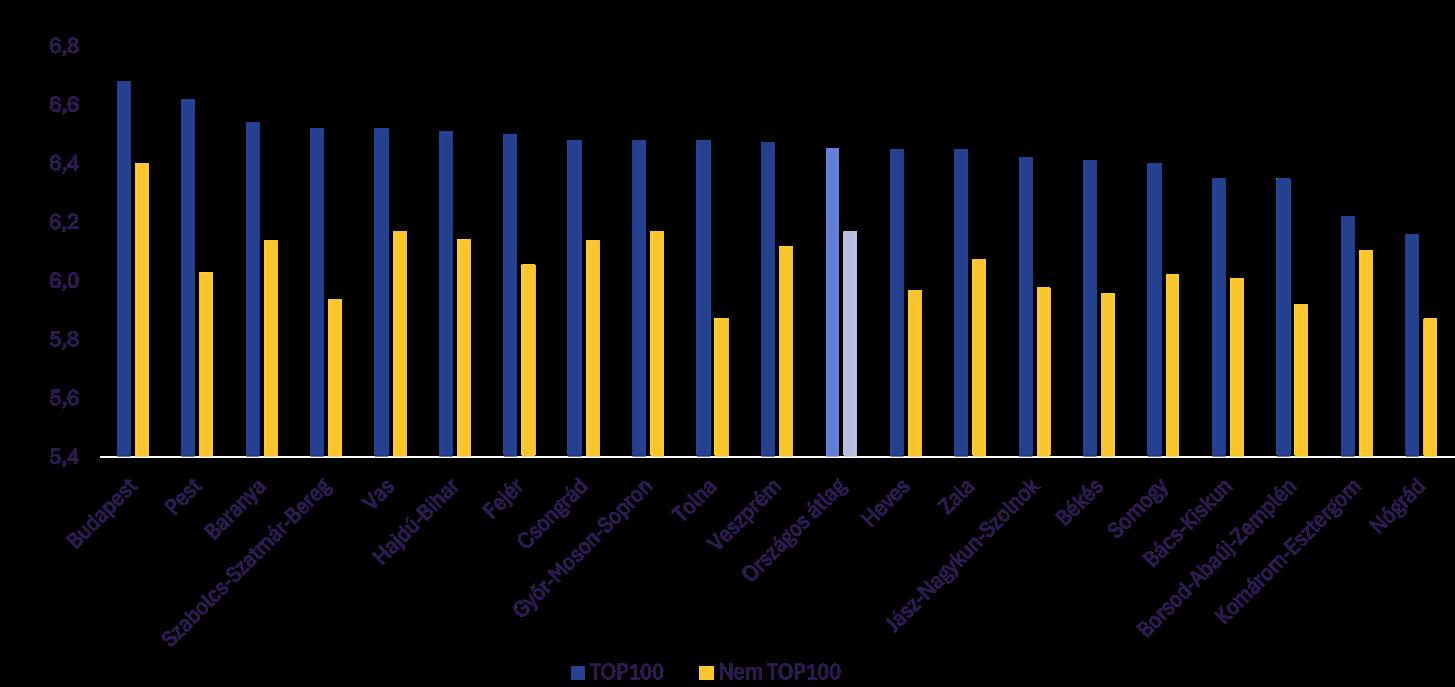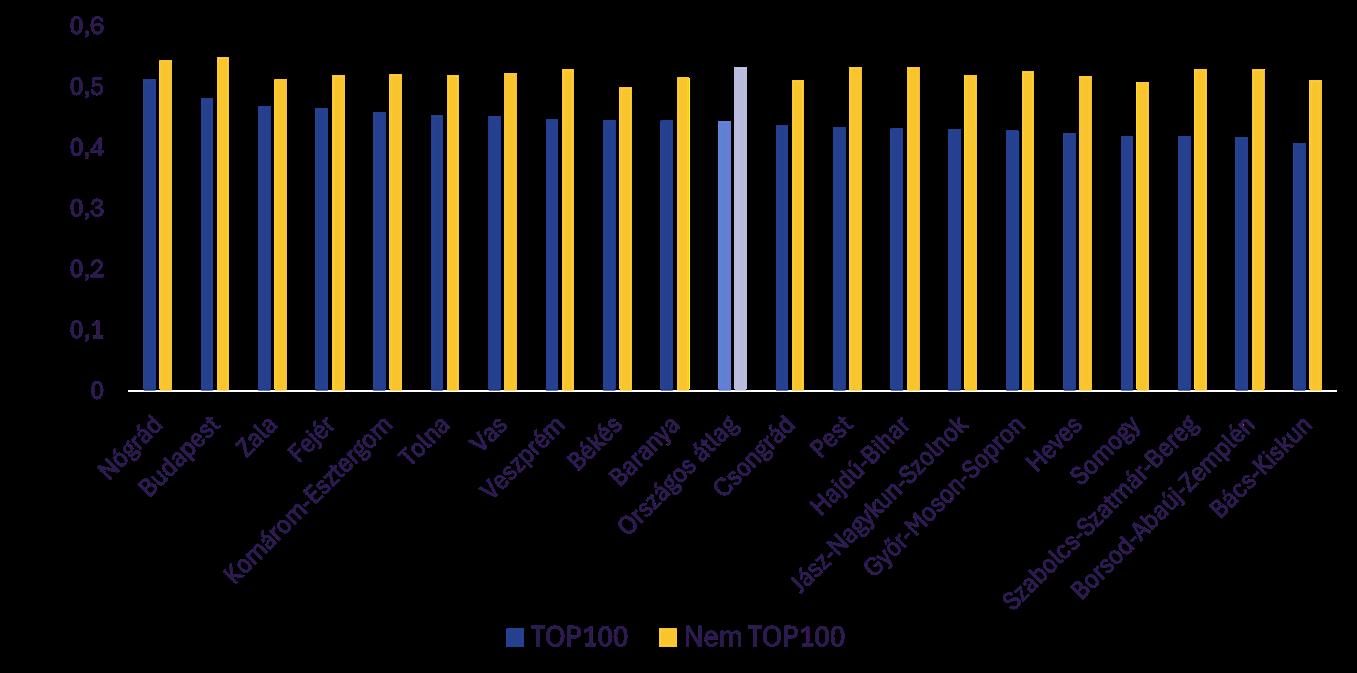 Az átlagos score kompozit index minden vármegye esetében magasabb a nem TOP100 körben, mint a TOP100-ak esetében. A különbség általában annál nagyobb, minél kisebb a TOP100-ak körében mért érték, ami azt jelzi, hogy alapvetően a TOP100-ak esetében merülnek fel területi különbségek.