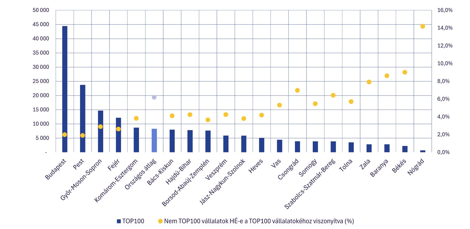A TOP100 vállalat között átlagosan 39% a külföldi tulajdon aránya, miközben a nem TOP100 vállalat esetében ez mindössze 12%. Öt vármegyében a TOP100 vállalatok több mint fele külföldi tulajdonban van, a nem TOP100 vállalati körben viszont 17 vármegyében az arányuk a 10%-ot sem éri el. A TOP100 cégek körében a külföldi vállalatok átlagos árbevétele számottevően meghaladja a hazai tulajdonú vállalatokét köszönhetően az erős exportorientáltságuknak. Budapest kivétel: a hazai tulajdonú vállalatok átlagos árbevétele 620 milliárd forint jelentősen felülmúlva a külföldi cégek átlag 277 milliárd forintos árbevételét. A külföldi feldolgozóipari vállalatok által dominált vármegyékben a hazai cégek árbevétele jellemzően csupán 15–35%-a a külföldi vállalatokénak. A külföldi tulajdonú vállalatok kulcsszerepet játszanak a területi GDP-termelésben és a foglalkoztatásban, de a stratégiai döntéseik gyakran nem helyi szinten születnek. Ez korlátozhatja a térségi társadalmi és környezeti szempontok érvényesülését. A hosszú távú gazdasági stabilitás érdekében kiemelt feladat a hazai vállalatok exportpotenciáljának erősítése és a helyi gazdaságfejlesztési érdekérvényesítés megerősítése, különösen azokban a térségekben, ahol a külföldi vállalatok dominanciája a legerősebb.