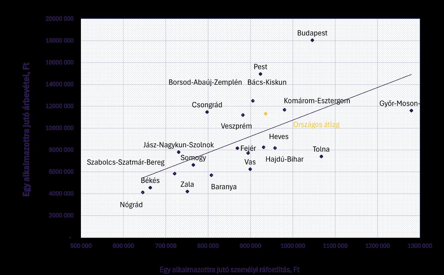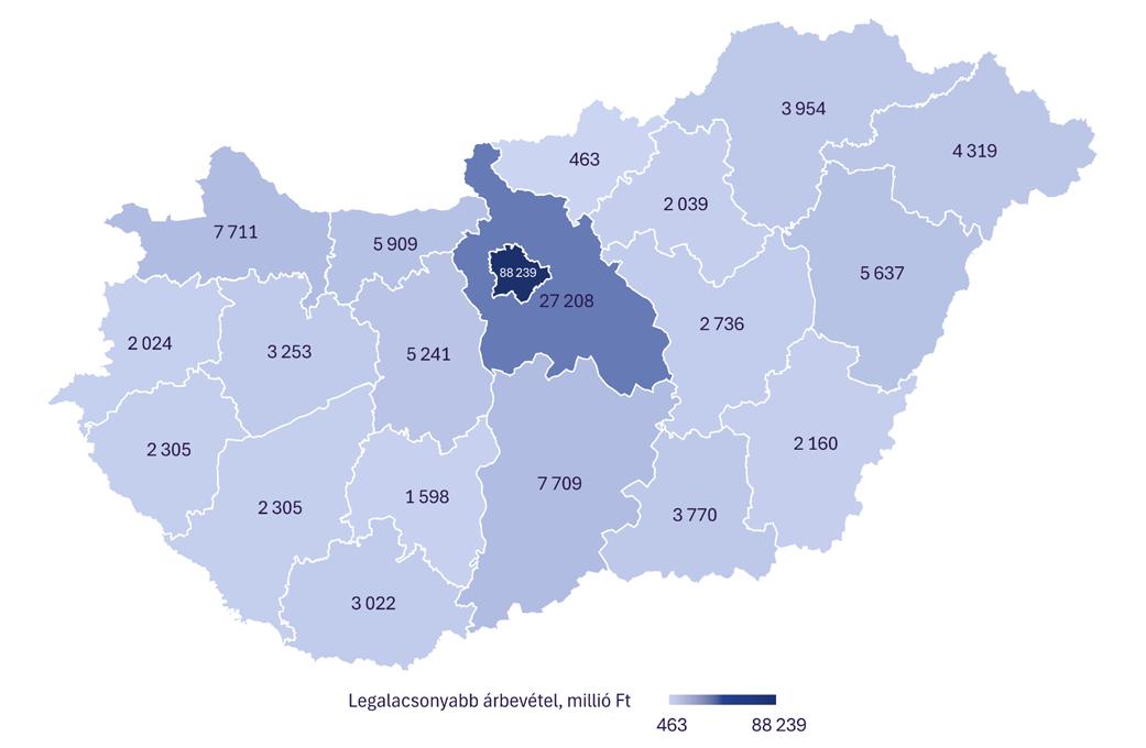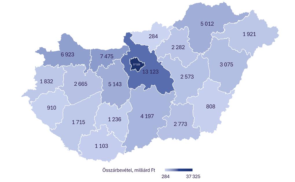 Az összárbevétel színesebb képet mutat, mint a belépési küszöb. Nógrád vármegye mellett Baranya, Békés, Tolna és Zala vármegye is jelentősen elmarad a középmezőnytől, amelyet az erős feldolgozóipari alappal rendelkező vármegyék – Bács-Kiskun, Borsod-Abaúj- Zemplén, Fejér, Győr-Moson-Sopron és Komárom-Esztergom – alkotnak.