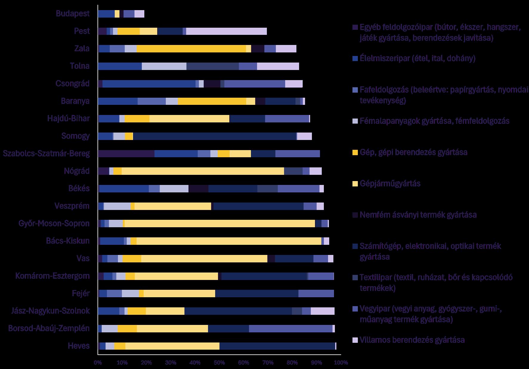 ► A vármegyék többségében a feldolgozóipar állítja elő az exportárbevétel 69–98%-át, Budapesten mindöszsze 19%-át. Azon belül a gépjárműgyártásnak van kiemelkedő szerepe.