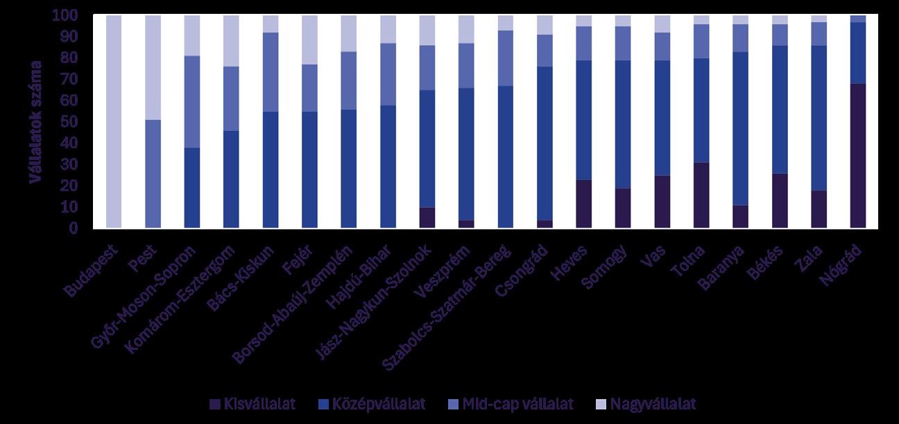A TOP100 vállalatok többsége kkv, de jelentős számmal képviselik magukat a mid-cap vállalatok1 is. Az árbevételt és a létszámot is figyelembe véve a budapesti TOP 100 a nagyvállalati kategóriába tartozik. Sok vármegye esetében viszont a mid-cap kategória beemelésével a nagyvállalatok egy része mid-capként szerepel az elemzésben. Nógrád esetében például mindhárom, létszám alapján nagyvállalatként definiálható vállalat mid-capnek számít az alternatív megközelítés alapján. A mid-capek száma Pest vármegyében a legmagasabb (51), de Győr-Moson-Sopron, Bács-Kiskun és Komárom-Esztergom vármegyében is erős a jelenlétük.