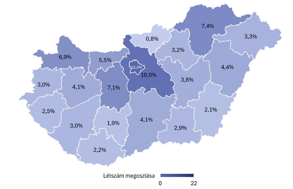 ► A személyi ráfordítások vármegyei szinten erősen koncentráltak: Budapest és Pest vármegye kivételével minden vármegyében a TOP100 vállalatok részesedése meghaladja az 50%-ot.