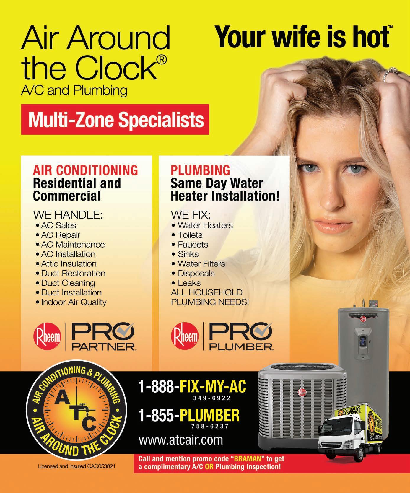 Throughout his success, Mike has maintained realistic goals, made attainable by focusing on the client. Air Around the Clock’s philosophy of providing unbeatable customer service and quick response times have made them the top Rheem and American Standard contractors in the United States, as well as being number one in large multi-zone homes. ATC has recently added both a plumbing division and a financing arm for clients unable to pay for work upfront. After all, hot wives across Florida deserve highquality HVAC service, regardless of their current financial situation.