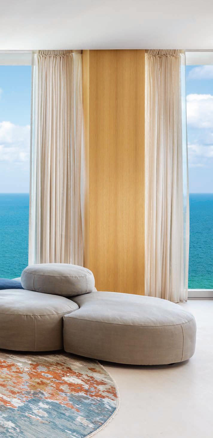 High on the thirty-eighth floor of the Jade Signature tower, this Sunny Isles Beach residence boasts views of both the Miami skyline and the Atlantic Ocean. Heverton Silva and Eleonora Hildebrand of HS Arquitectura emphasized the building’s relationship with nature and its surrounds within the interior design. They knew that the stunning turquoise waters would be the perfect backdrop for a photograph by Flávia Junqueira, a Brazilian artist whose images bring a fantastical feel to real-world environs. The positioning of this photo does the same, acting as a playful focal point for the welcome sitting area that also includes a seascape-inspired rug by Oriental Rug Company, an ottoman grouping by Living Divani, and Gio Ponti side chairs from Molteni&C. (hsarq.com)