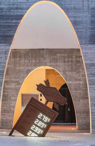 Memories of the late Louis Vuitton ar tistic director Virgil Abloh are sprinkled throughout the plazas, including this sculpture of a Sunoco gas pump with prices we can only dream about today. To find this Abloh-designed relic, cross through Daniel Toole’s Jade Alley, where concrete walls and facades create tugs between shadow and light.