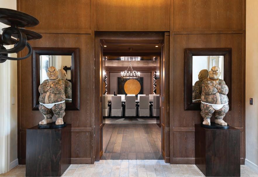 This Venetian Islands home subtly showcases the passions of its owners. With the goal of creating vignettes in which each piece in the couple’s art collection could stand out, Charlotte Dunagan and Thomas Diverio of Dunagan Diverio Design Group opted for clean lines and natural-hued interiors. Outside of the degustation room, a pair of warrior statues by Japanese artist Takeshi Haguri stand guard. Embedded with a series of 12 photos entitled Day by Day Good Day by Peter Dreher, a concealed panel door leads to the wine-tasting area, where Harvest Moon by Matthew Day Jackson warms the space and beckons visitors to enter and imbibe. (dunagandiverio.com) .