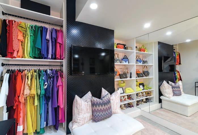 To maximize closet functionality, section things off fi rst by the type of clothing and then by color according to ROY G BIV—red, orange, yellow, green, blue, indigo, and violet. Then add in neutrals like tan, brown, black, gray, and white. Not only does this look beautiful, it truly makes it easier to fi nd things when you need them.