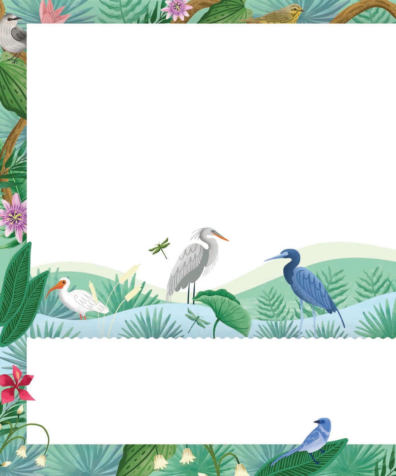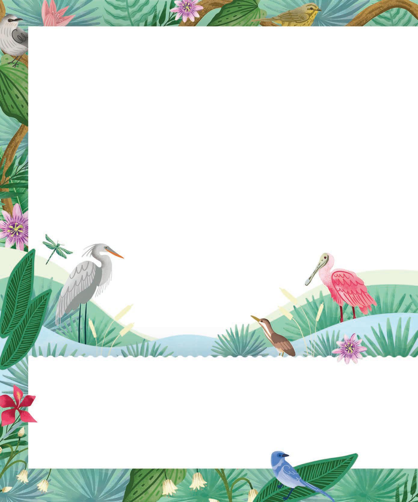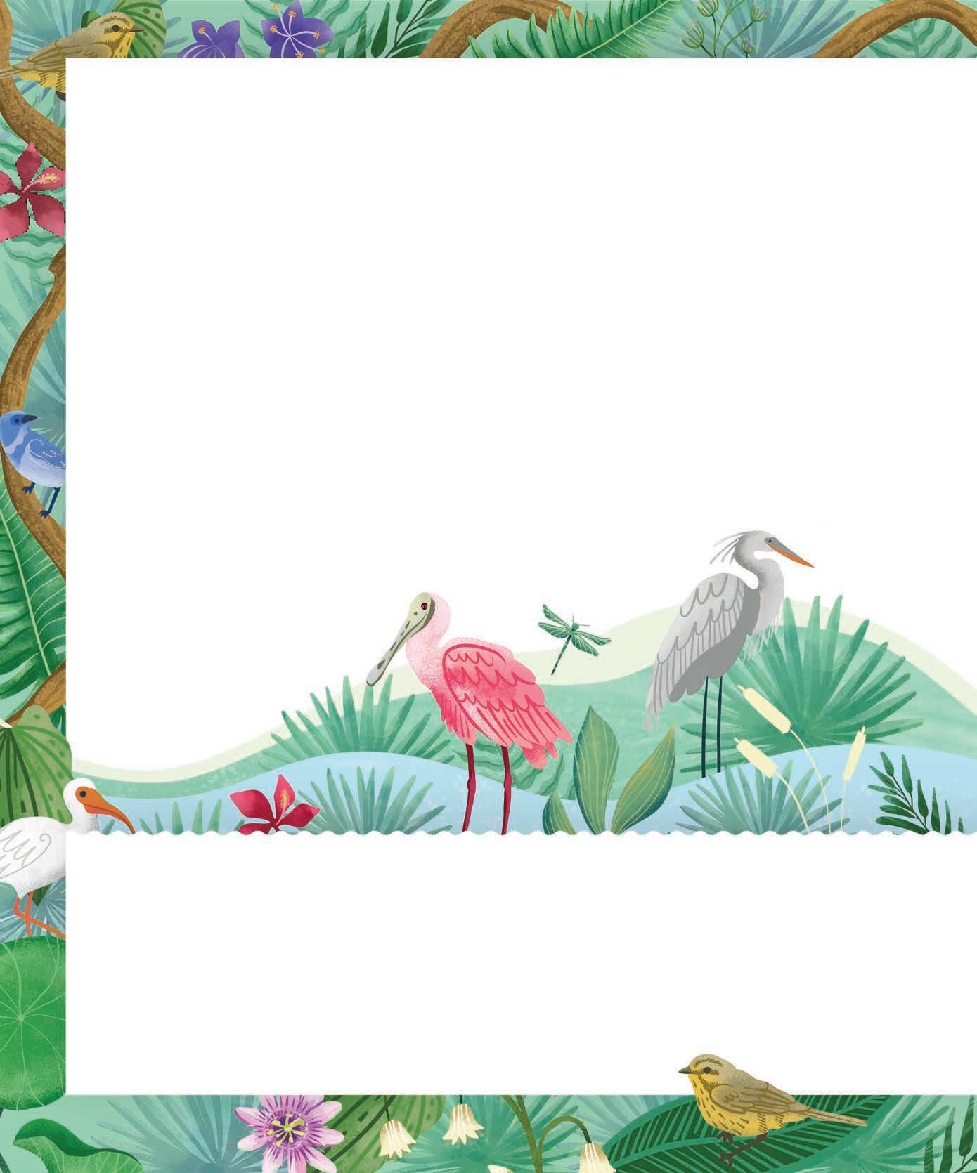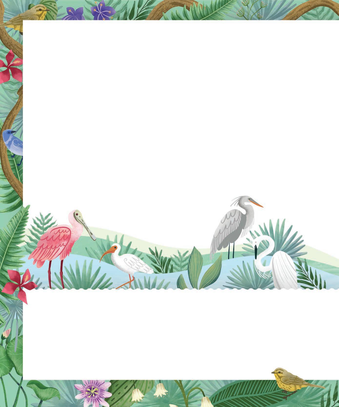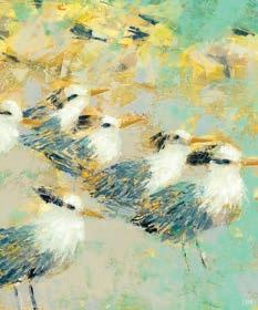 Artist Dora Knuteson says that a lifelong love of animals has inspired her dedication to environmental conservation. She has donated proceeds of sales to nonprofits such as Friends of Rookery Bay, and her creations have been licensed by companies with aligned missions, including Leeward Look. A detail of her 36” x 48” acrylic on canvas painting, Let’s Go to South Beach II, featuring a flock of