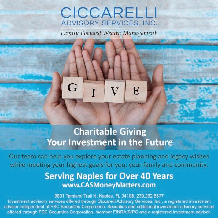As Southwest Florida recovers from the devastating effects of Hurricane Ian, supporting our local charities is more impor tant than ever. Naples’ unparalleled philanthropic spirit has always been a beacon in dark days, and it has been truly touch ing to see this community come together to heal and rebuild. The Naples Charity Register is proud to support the efforts of local non profits so they can be there for our neighbors in need.