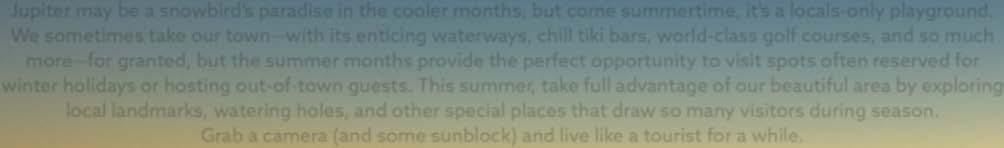 In The Local section, which starts on page 27, we take a peek at the plans for the Treasure Coast Agriplex, a 100-acre property in the works that will not only be the new home of the Martin County Fair but will also offer amenities like an agriculture farm, gardens, a livestock arena, motocross tracks, an equestrian center, archery, and more. We also offer a few suggestions for hot beach reads in case you’re looking for a new book to get lost in this summer. Enjoy our July/August issue, and we’ll see you in the fall!