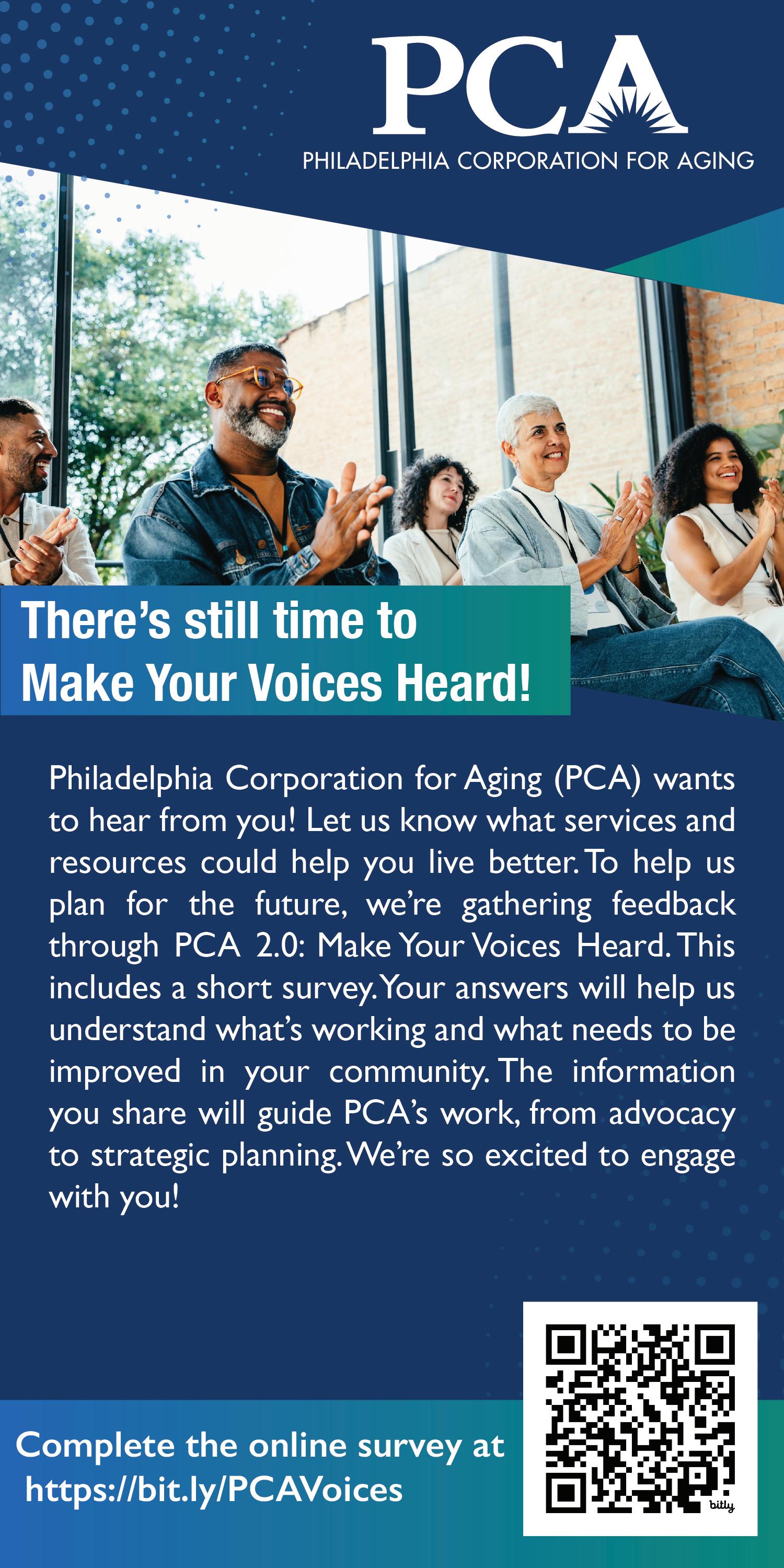 If you would like to help support PCA programs that benefit older adults in Philadelphia, call the PCA Helpline at 215-765-9040 or visit www.pcaCares.org/ support-pca to learn more or make a donation.