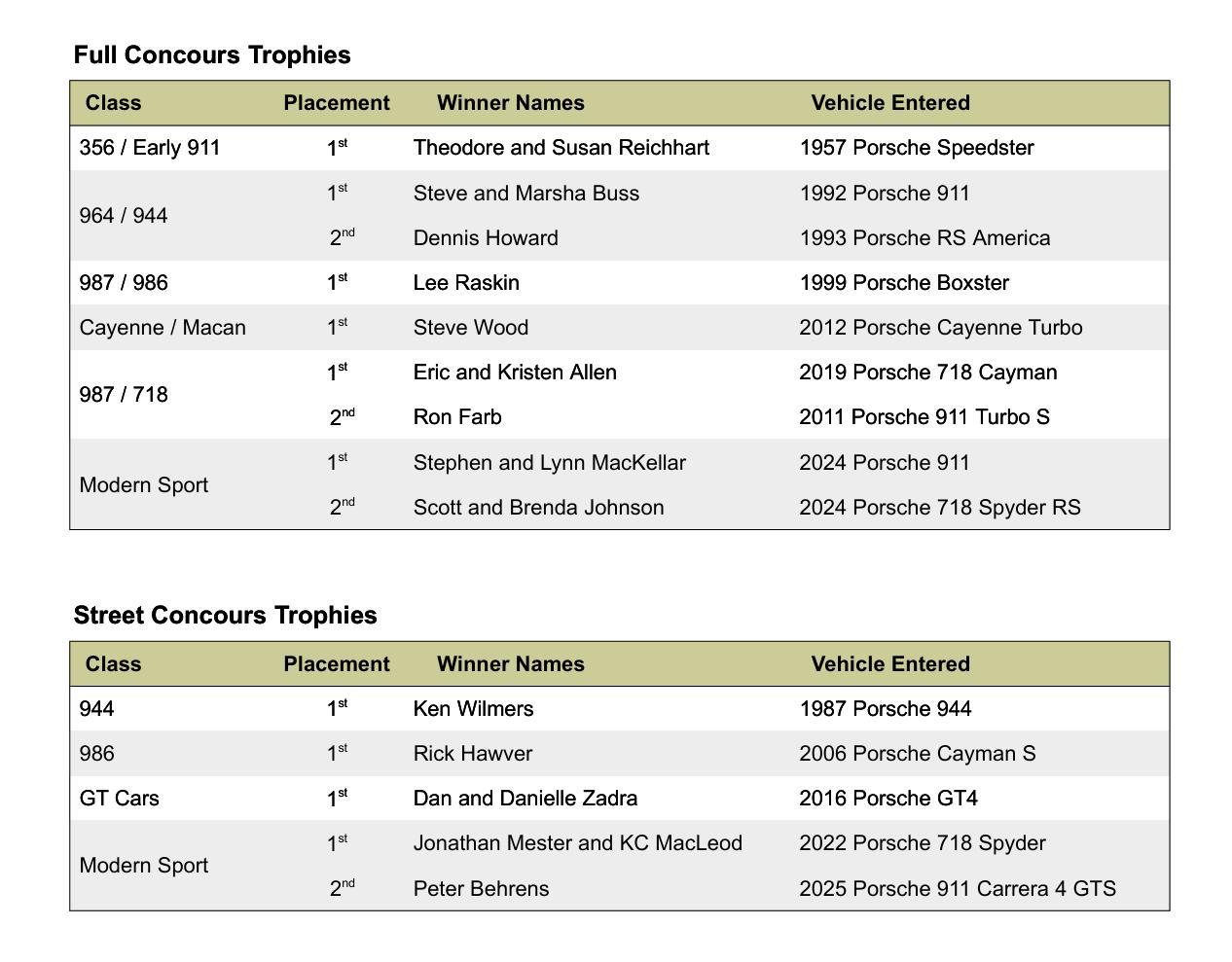 September was an event filled month. National held their annual Open House, made special by adding in their 70Th Anniversary celebration. Following that was the Chesapeake Region celebration at our valued sponsor Porsche Hunt Valley where over 200 members joined the party. We proudly honored eighteen members for their 40+ years of PCA membership, and almost all the past Presidents were in attendance to congratulate them. The 56th Annual Chesapeake Challenge was held at Frey’s Brewery, and we had a terrific turnout and gorgeous weather. The winner of the Knowlton P. Long Lufthansa Trophy was Ellen Beck. Congratulations on two years in a row! The winner of the Chesapeake Cup was Dan Zadra. Congratulations Dan! I want to thank Kristen Allen for all her time and effort planning a wonderful CC56 and my wonderful wife, Marsha, for all her input and support during the event planning and helped everyone throughout the day. Thanks to Paul Koenigsmark and Dan Zadra for setting up the Concours event. Thanks to Rich Ehrlich for the incredibly challenging but fun Gimmick Rally and to Randy Richter for the always difficult but educational Tech Quiz. Thanks to Yumi Sanchez and Marsha Buss for managing the Registration process and to Jess Sanchez for making sure the Concours cars made it to their proper parking spot. Lastly, a huge Thank You to All of the volunteers who worked throughout the day to make this terrific event run smoothly. A special thank you to Paul Koenigsmark for tabulating all the results in a not so simple spreadsheet. We appreciated you working through dinner to identify the winners.