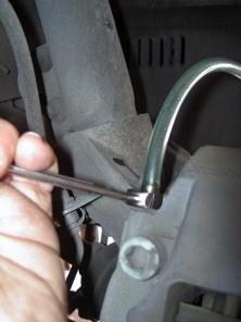 With the system pressurized start with the right rear wheel and pop off the two bleed caps. Place the drain hose and wrench on the nipple and loosen it. Make sure to catch the flow in a receptacle. Do both nipples until you get new fluid coming out. If you alternate fluid colors from blue to gold and back, you can clearly see when the new color starts coming out. Then move to the left rear, the right front and finally the left front.