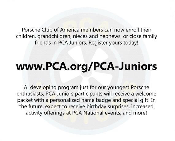 The PCA Juniors program has been created so kids can enjoy PCA events, learn about Porsches and build the enthusiasm that runs through all of the Porsche Club of America.
